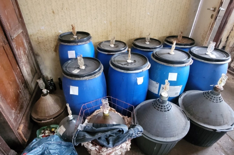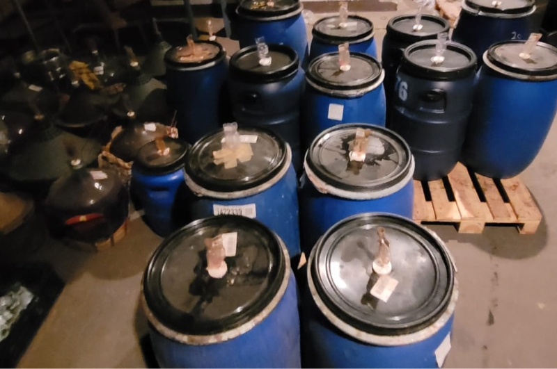 Podczas przeszukania posesji funkcjonariusze zabezpieczyli linię do produkcji nielegalnego alkoholu, 109 butelek zawierających 57 litrów gotowych wyrobów alkoholowych, piętnaście 100-litrowych beczek z tworzywa sztucznego oraz 15 szklanych gąsiorów wypełnionych zacierem, z którego miał powstać nielegalny alkohol.