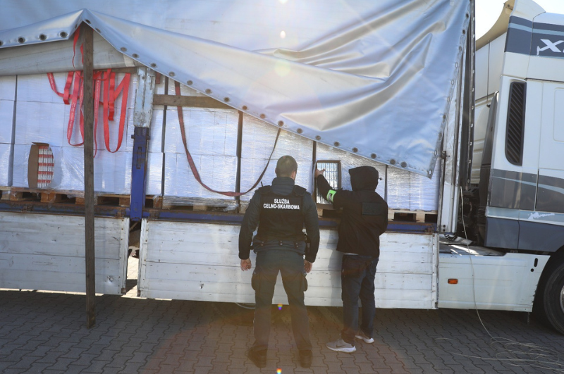 W wytypowanym do kontroli samochodzie ciężarowym, w którym kierowca przewoził oficjalny ładunek, funkcjonariusze znaleźli za przepierzeniem i zabezpieczyli prawie 7 mln szt. papierosów bez polskich znaków akcyzy.