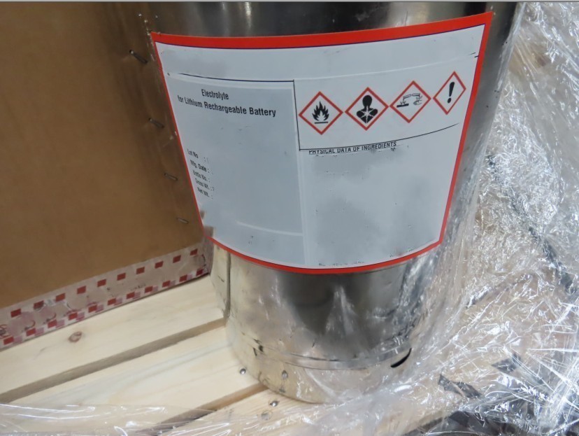 Przemieszczany w dwóch z czterech beczek elektrolit utracił wartość użytkową z powodu upływu terminu przydatności, w związku z czym uznano go za odpad. Analiza zdjęć i etykiet wykazała, że elektrolit składa się głównie z rozpuszczalników organicznych i soli litu (<20%) oraz posiada właściwości łatwopalne, toksyczne, żrące i ekotoksyczne.