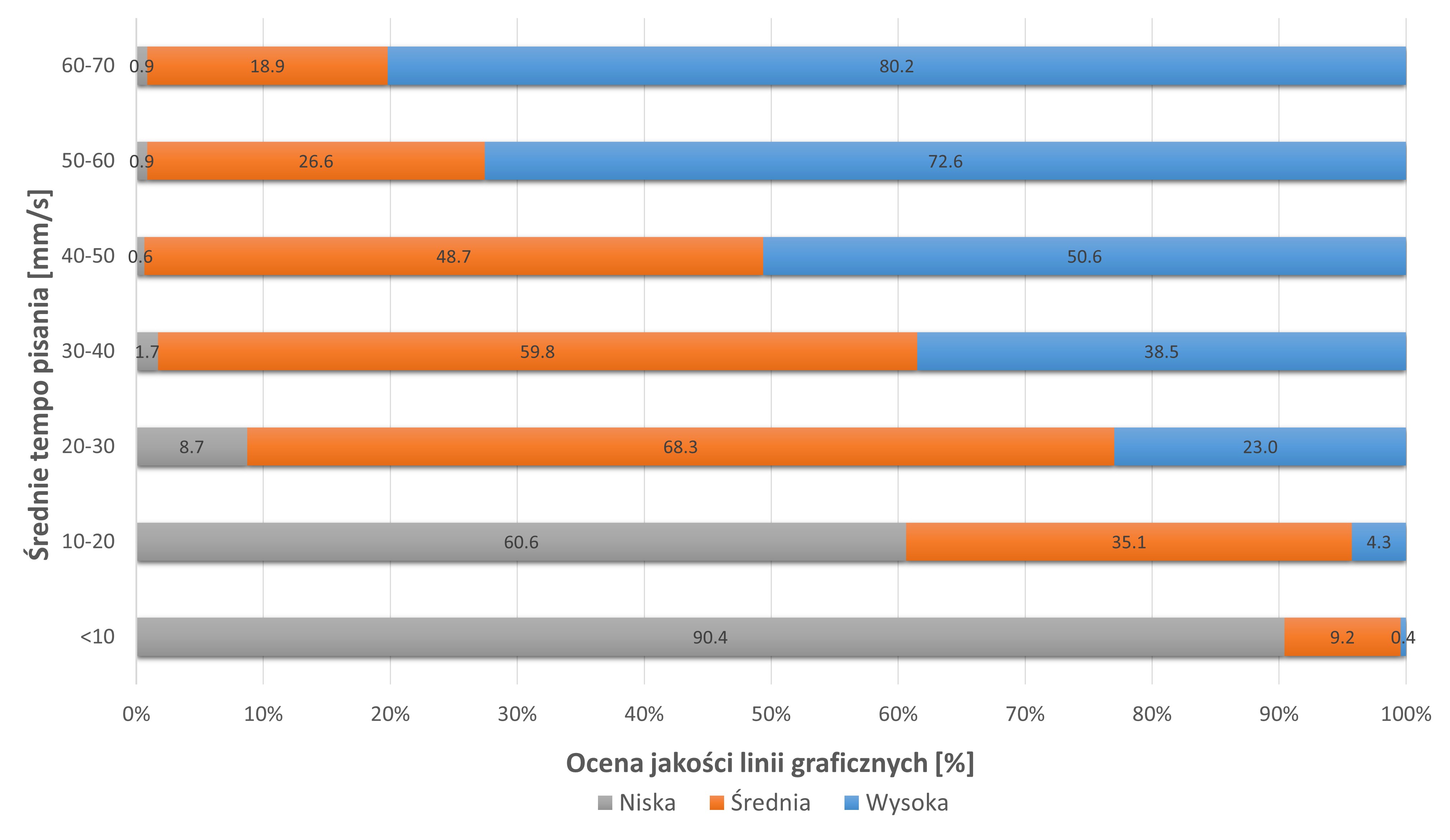 Wyniki eksperymentu dowiodły, że wraz ze wzrostem tempa kreślenia rośnie udział wysokich ocen jakości linii, natomiast maleje odsetek ocen niskich. Autorzy potwierdzili tym samym, że percepcja płynności pisma znajduje odzwierciedlenie w obiektywnej szybkości pisania. Ustalono także, w jakich przedziałach tempa kreślenia próbki oceniane były przez większość ekspertów jako płynne lub pozbawione płynności. Uzyskane rezultaty mają istotne znaczenie metodologiczne i praktyczne, ponieważ potwierdzają empirycznie trafność sposobu oceny jednej z kluczowych cech pisma ręcznego oraz wzmacniają naukowe podstawy stosowanej w tym zakresie metodyki badawczej.