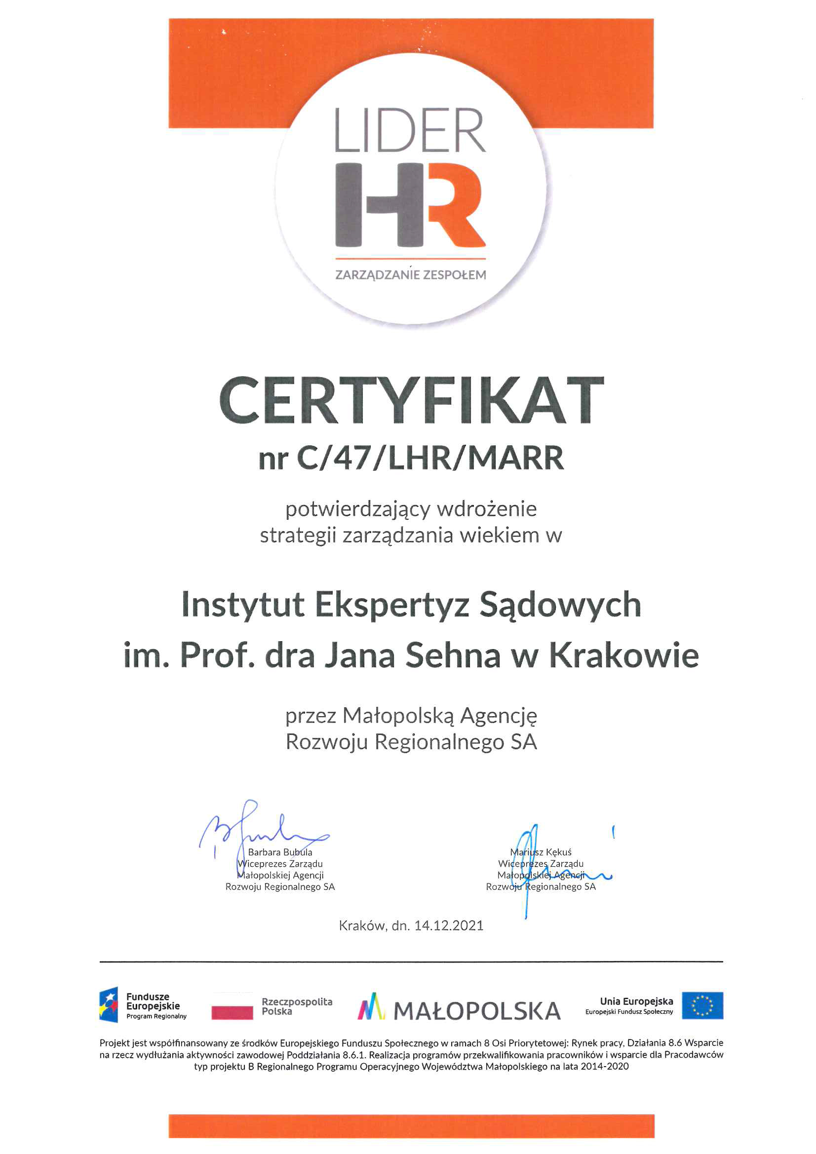 W dniu 14 grudnia 2021 roku Instytut Ekspertyz Sądowych uzyskał certyfikat potwierdzający wdrożenie „Strategii zarządzania wiekiem”, która została opracowana w ramach projektu „Lider HR – zarządzanie zespołem wielopokoleniowym, realizowanego przez Małopolską Agencję Rozwoju Regionalnego S.A., w ramach Regionalnego Programu Operacyjnego Województwa Małopolskiego na lata 2014–2020, 8. Oś Priorytetowa – Rynek Pracy, Działanie 8.6: Wsparcie na rzecz wydłużania aktywności zawodowej, Poddziałanie 8.6.1: Realizacja programów przekwalifikowania pracowników i wsparcie dla pracodawców.