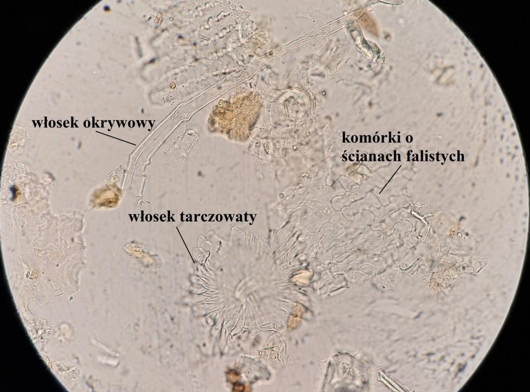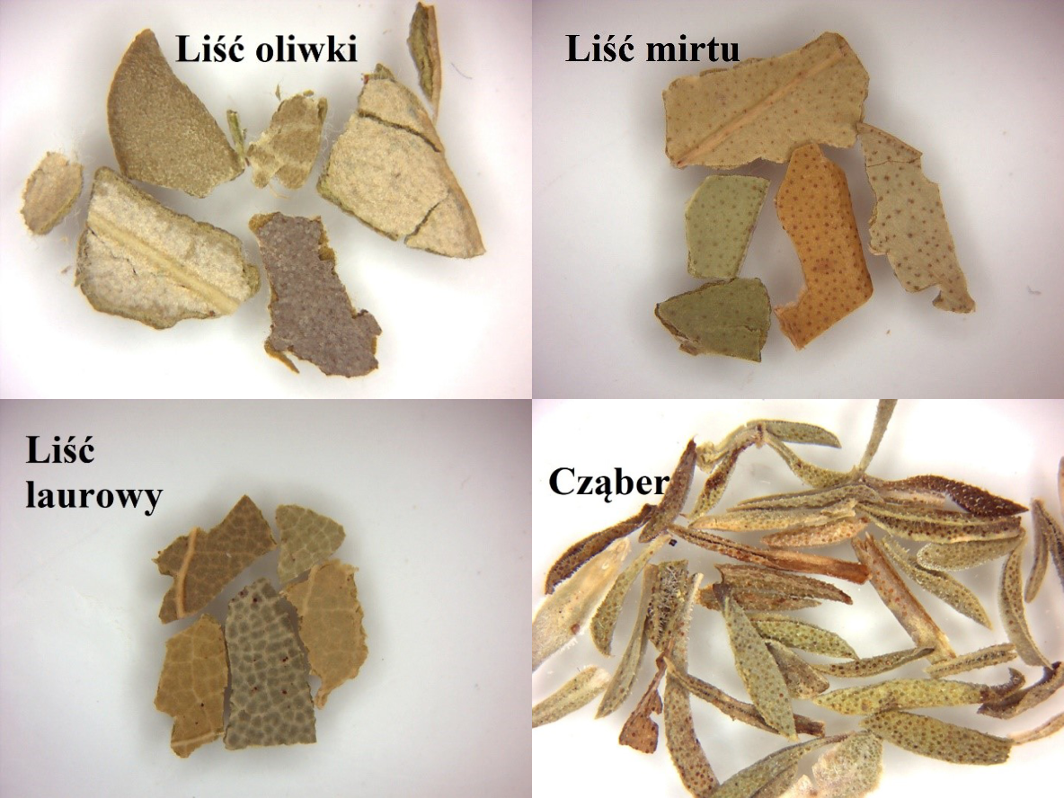 b) metoda mikroskopowa przy użyciu mikroskopu biologicznego, przy powiększeniu np. 200x, stosowana jest w przypadku oregano w postaci sproszkowanej, w celu wykrycia zafałszowania dodatkiem mielonego liścia oliwki, identyfikując cechy diagnostyczne liścia oliwki wg Farmakopeii Polskiej.