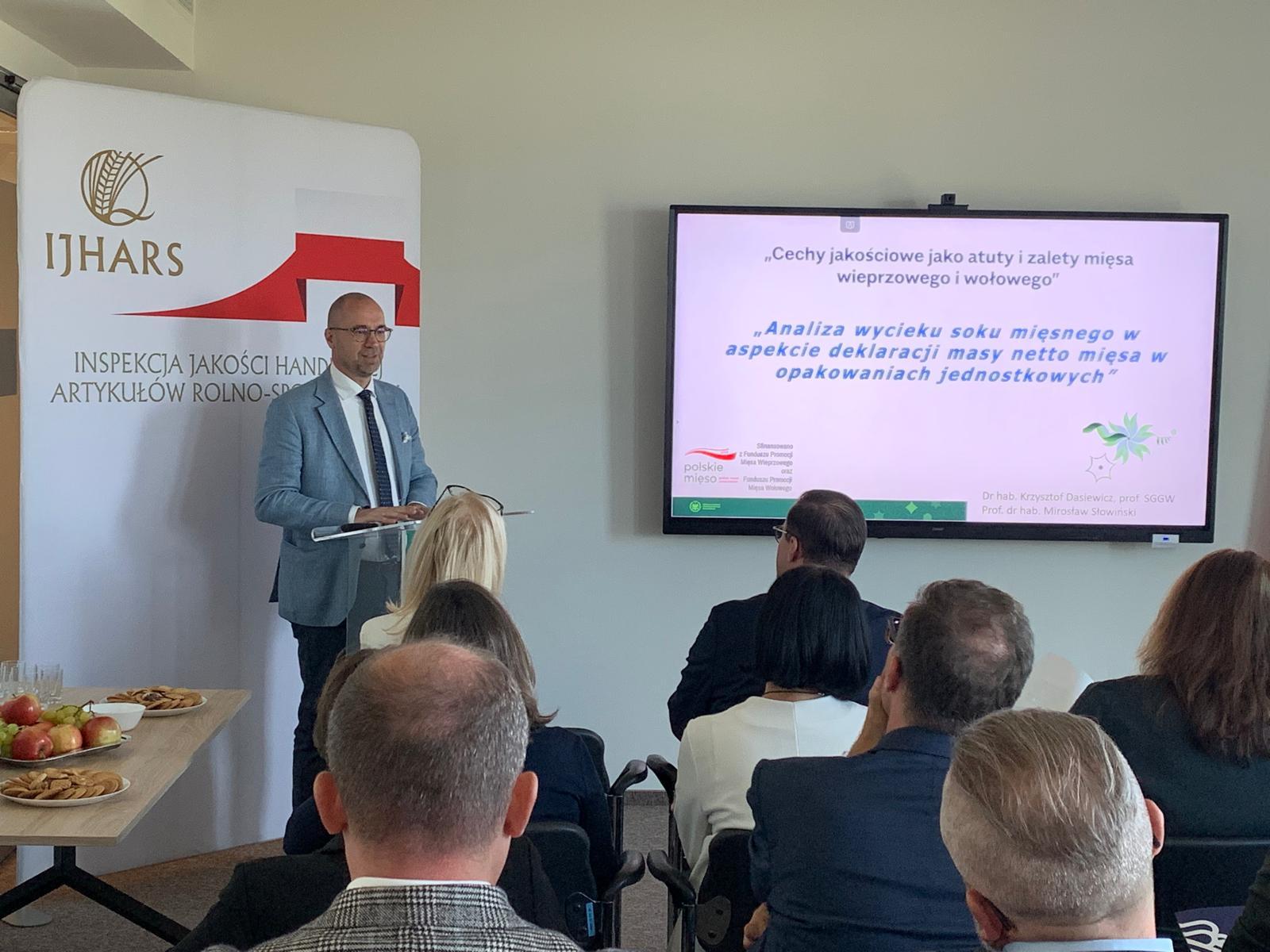 Wyniki badań naukowych w tym zakresie przedstawił dr hab. Krzysztof Dasiewicz, prof. SGGW w prezentacji nt. „Wyciek soku mięsnego w aspekcie deklaracji masy netto mięsa w opakowaniach jednostkowych.”