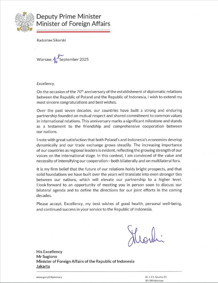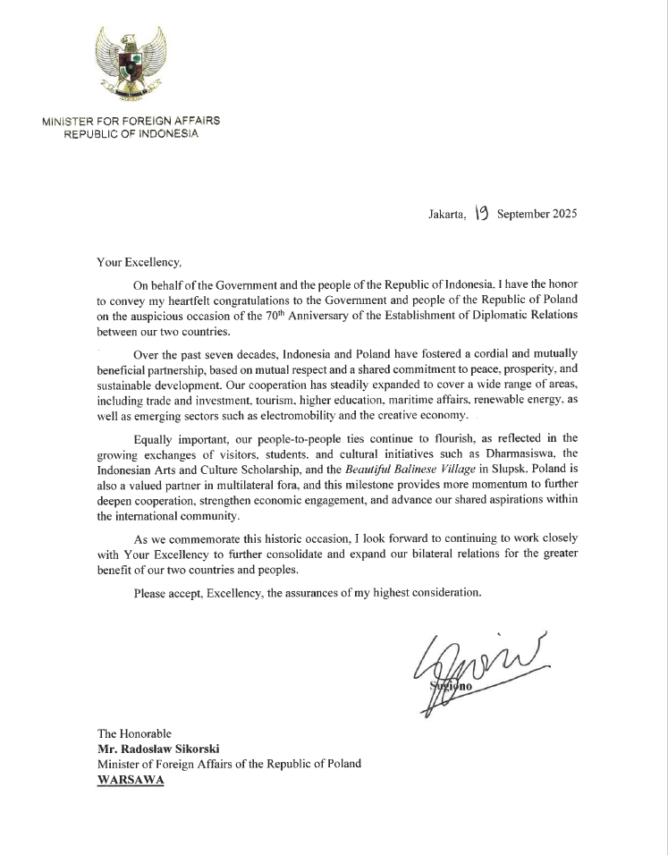 On September 19, 2025, we celebrate the 70th anniversary of the establishment of diplomatic relations between Poland and Indonesia.