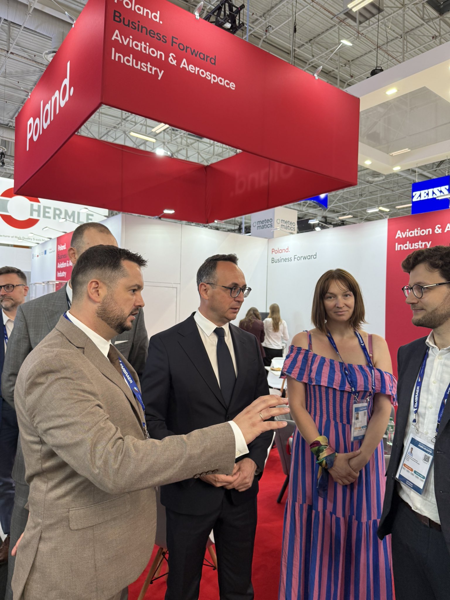 Podczas targów minister Dariusz Klimczak odwiedził polskie stoisko narodowe organizowane przez Polską Agencję Kosmiczną oraz Ministerstwo Rozwoju i Technologii.