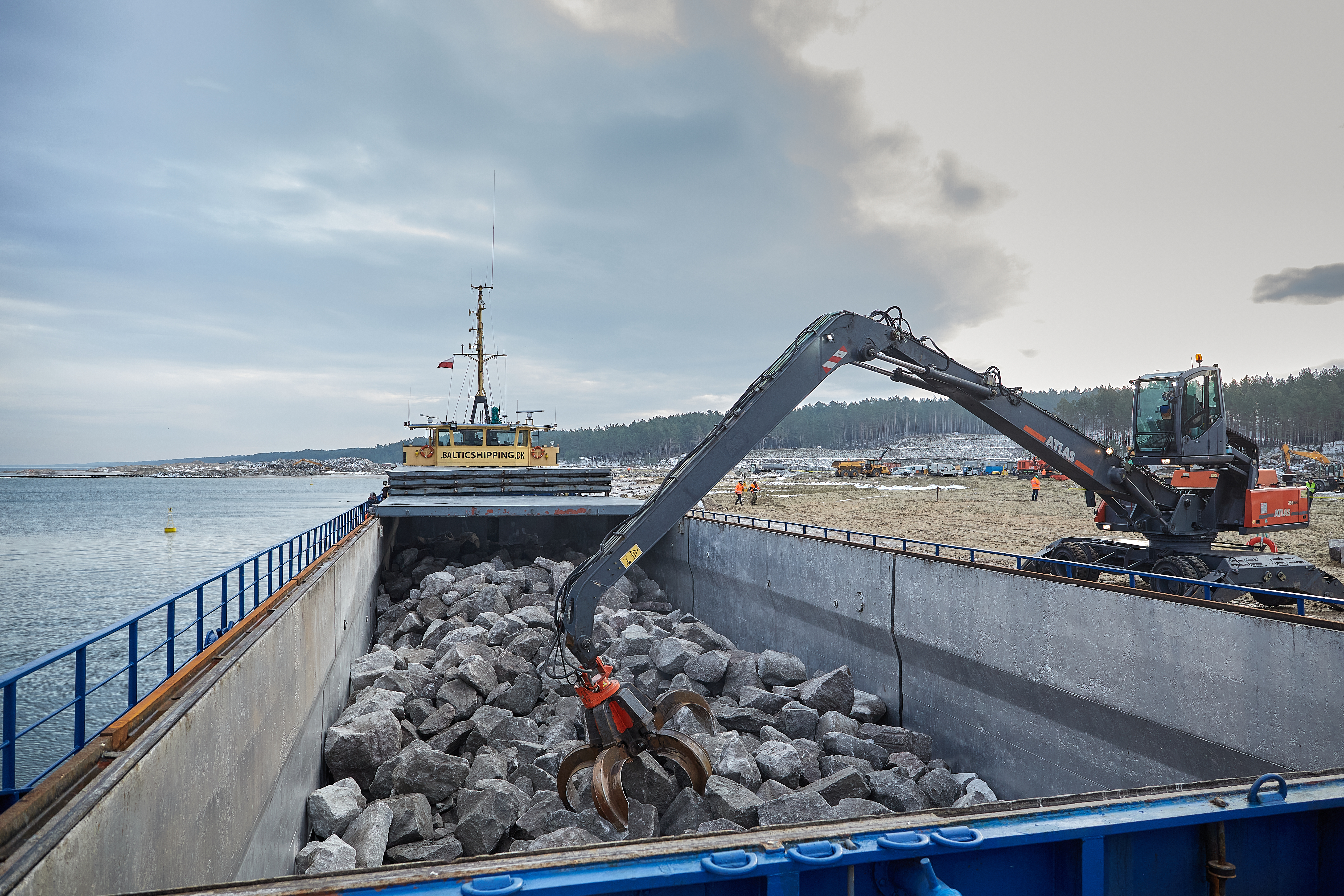 Statki cumując w Porcie Zewnętrznym są dodatkowo chronione przed ewentualnymi złymi warunkami pogodowymi przez tymczasową groblę usypaną z kamienia. Rozładunek ze statków trwa około 10 godzin i odbywa się przy pomocy specjalnej koparki z chwytakiem do kamienia. Kamień po rozładowaniu hałdowany jest na placach składowych za nabrzeżem Południowym i praktycznie od razu wbudowywany w falochrony.