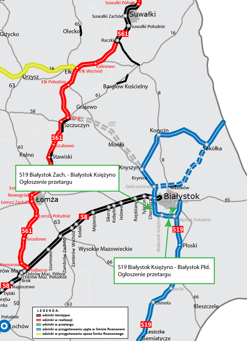- S19 od węzła Księżyno do węzła Białystok Południe (7,9 km), wraz z budową DK65 od węzła Białystok Południe do planowanego ronda w rejonie Grabówki (13,6 km) – wylot z Białegostoku w kierunku granicy z Białorusią.