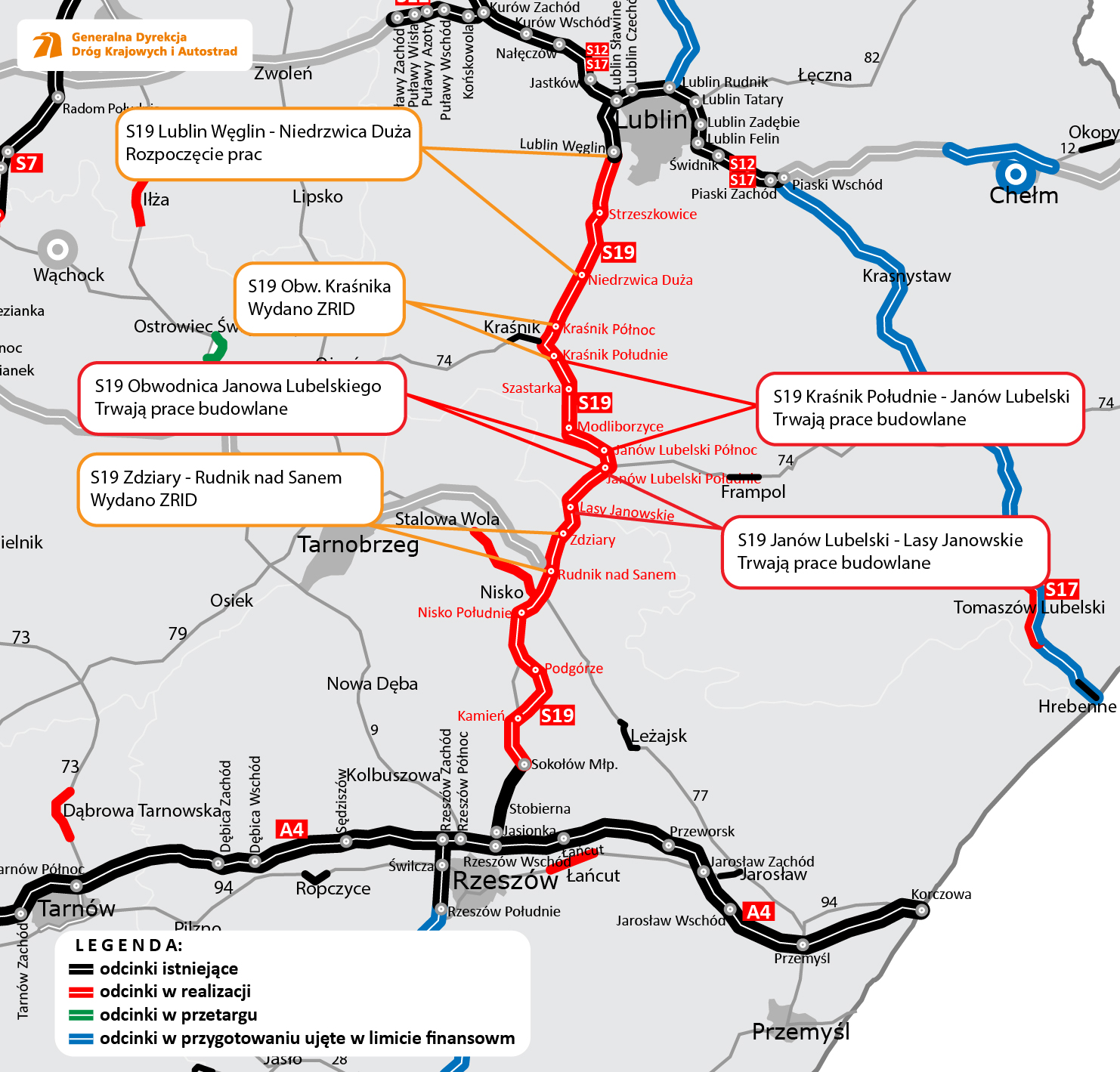 7 października 2019 r. wojewoda lubelski wydał zezwolenia na realizację inwestycji drogowej (ZRID) dla obwodnicy Kraśnika. Również 7 października 2019 r. wojewoda podkarpacki wydał ZRID na pierwszy z sześciu odcinków przyszłej S19 pomiędzy węzłem Lasy Janowskie a Sokołowem Małopolskim.