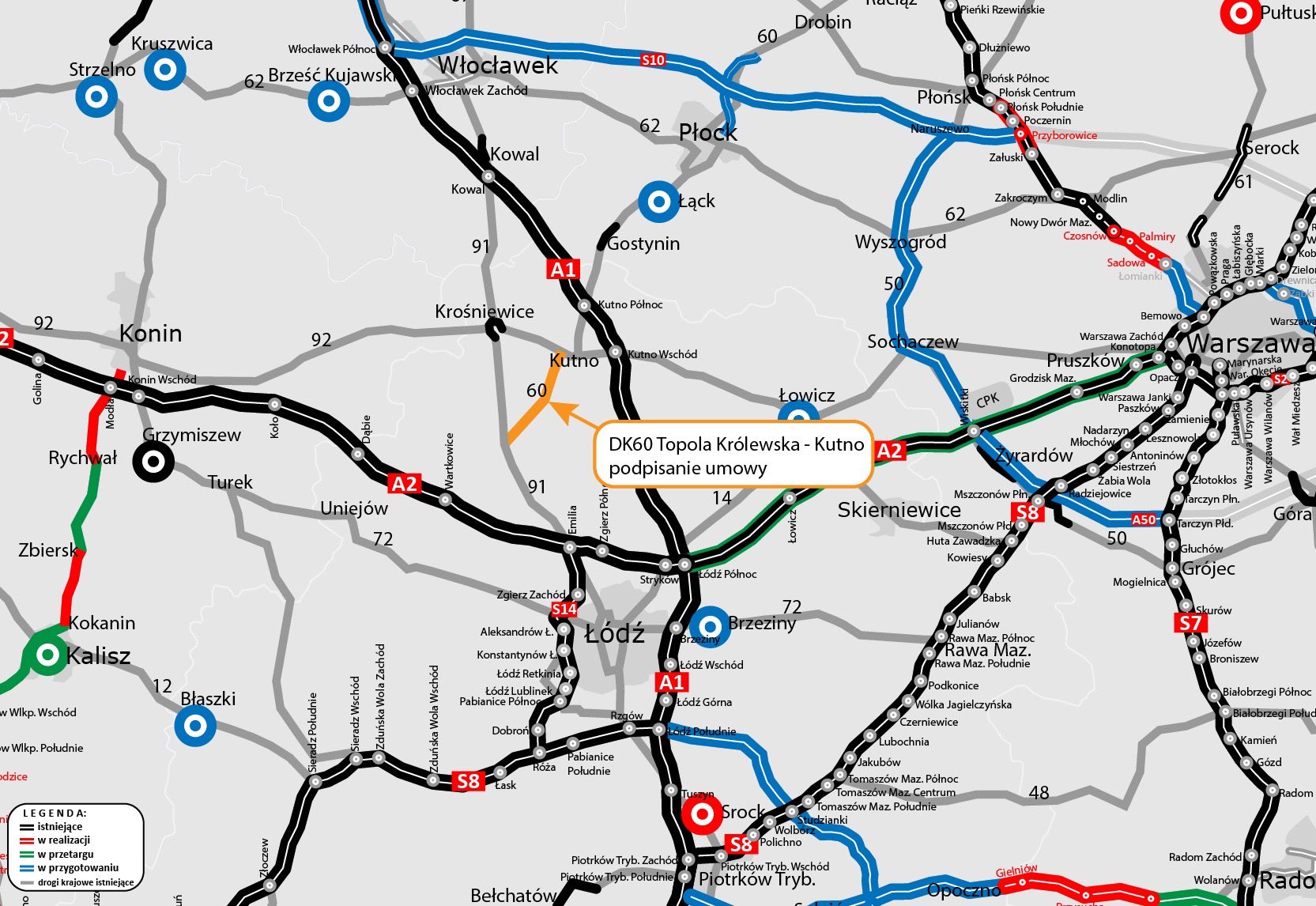 Generalna Dyrekcja Dróg Krajowych i Autostrad zawarła kontrakt na rozbudowę 20-kilometrowego odcinka drogi krajowej nr 60 pomiędzy Topolą Królewską a Kutnem. Zadanie wykona firma STRABAG, która złożyła ofertę o wartości 226 mln zł. Wykonawca będzie miał 22 miesiące na przeprowadzenie wszystkich prac (z wyłączeniem okresów zimowych 16 grudnia - 15 marca). W ciągu najbliższych dni drogowcy przekażą wykonawcy plac budowy.