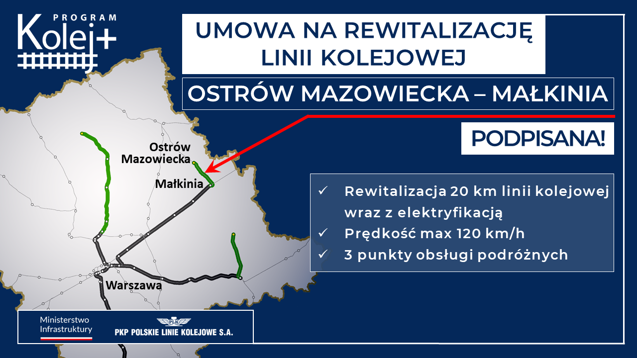 Połączenie kolejowe od Ostrowi Mazowieckiej do Małkini zapewni realizacja umowy na modernizację i elektryfikację 20 km linii o wartości ok. 300 mln zł. Umożliwi to wygodny dojazd do Warszawy w ok. 1,5 h. Na trasie przewidziano zwiększenie dostępu do kolei dzięki 3 nowym przystankom: Ostrów Mazowiecka Południe, Niegowiec i Błędnica. Odbudowane zostaną perony na stacji w Ostrowi Mazowieckiej oraz na przystankach Ostrów Mazowiecka Miasto i Biel. Wszystkie obiekty będą przystosowane do obsługi osób o organicznych możliwościach poruszania się. Przebudowa linii zwiększy również możliwości kolejowych przewozów towarowych.