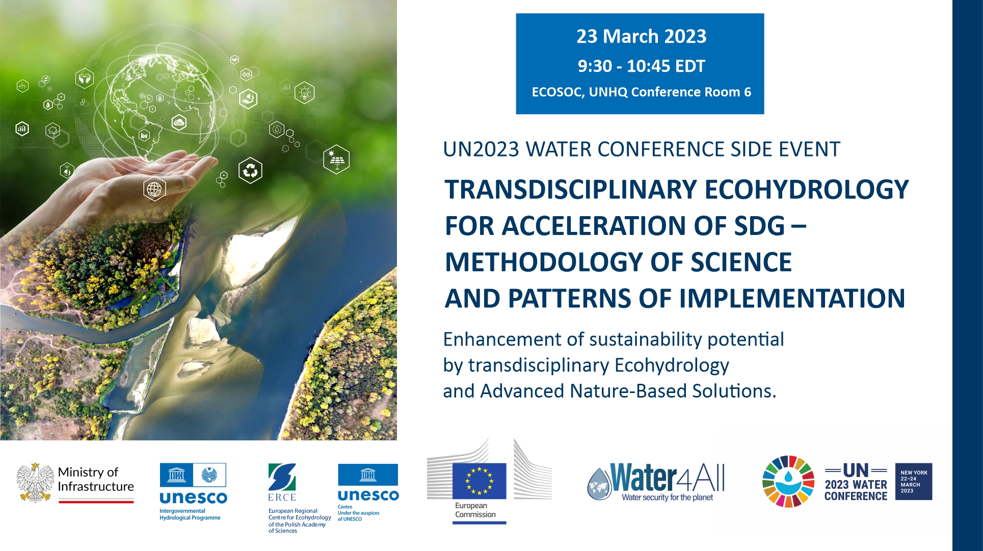 Ministerstwo Infrastruktury wraz z sekretariatem Intergovernmental Hydrological Programme UNESCO, Europejskim Regionalnym Centrum Ekohydrologii Polskiej Akademii Nauk oraz Europejskim Partnerstwem Water Security for the Planet (Water4All) zorganizowały wspólne wydarzenie towarzyszące Konferencji wodnej ONZ 2023 – „Transdisciplinary Ecohydrology for acceleration of SDG – methodology of science and patterns of implementation”.