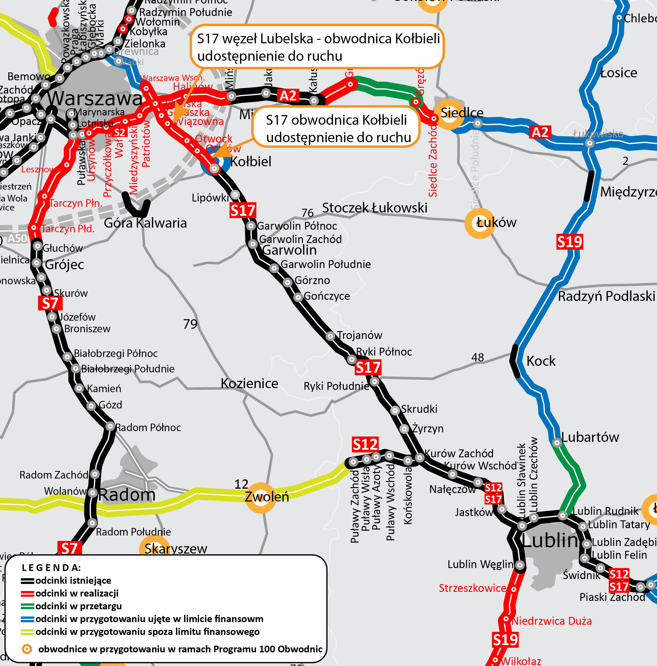 W ubiegłym roku GDDKiA udostępniła do ruchu pięć odcinków S17 od końca obwodnicy Kołbieli do węzła Kurów Zachód o łącznej długości ok. 70 km. Tym samym kierowcy mieli do dyspozycji ok. 155 km dwujezdniowej trasy aż do podlubelskich Piask. W grudniu 2019 r. przełożony został ruch na jedną jezdnię powstającej drogi S17 od Kołbieli do Warszawy. W maju tego roku wykonawca udostępnił wiadukt w ciągu drogi krajowej nr 50 w Kołbieli nad jezdnią trasy S17, co znacznie usprawniło ruch w tym miejscu. Od początku lipca 2020 r. kierowcy korzystają również z nowej jezdni w okolicach węzła Góraszka.