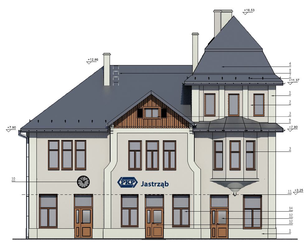 Budynek dworca na stacji Jastrząb pochodzi z 1917 r. i znajduje się w gminnej ewidencji zabytków. Ze względu na wartości architektoniczno-historyczne kształt bryły budynku nie ulegnie zmianie, a renowacja będzie polegała na odtworzeniu pierwotnego wyglądu dworca, wymianie wszystkich instalacji i wyposażeniu obiektu w nowoczesne systemy zarządzania budynkiem i obsługi podróżnych. Przebudowane będzie wnętrze budynku. Po modernizacji na parterze znajdą się hol dworca z ogrzewaną poczekalnią, ogólnodostępne toalety i pomieszczenia porządkowe oraz lokale przeznaczone na działalność handlowo-usługową wraz z zapleczem. Na pierwszym piętrze znajdą się pomieszczenia techniczne. W ramach inwestycji zagospodarowane zostaną także tereny przy dworcu. Powstanie parking dla samochodów, na którym wydzielone zostaną także miejsca w strefach krótkiego postoju (Kiss & Ride) oraz dla samochodów osób z niepełnosprawnościami. Przy dworcu znajdą się także elementy małej infrastruktury jak ławki, kosze na śmieci i wiata rowerowa. Wyburzone zostaną dwa budynki gospodarcze, a w ich miejscach stworzone zostaną tereny zielone. W czasie trwania prac budowlanych podróżni będą mogli korzystać z dworca tymczasowego.