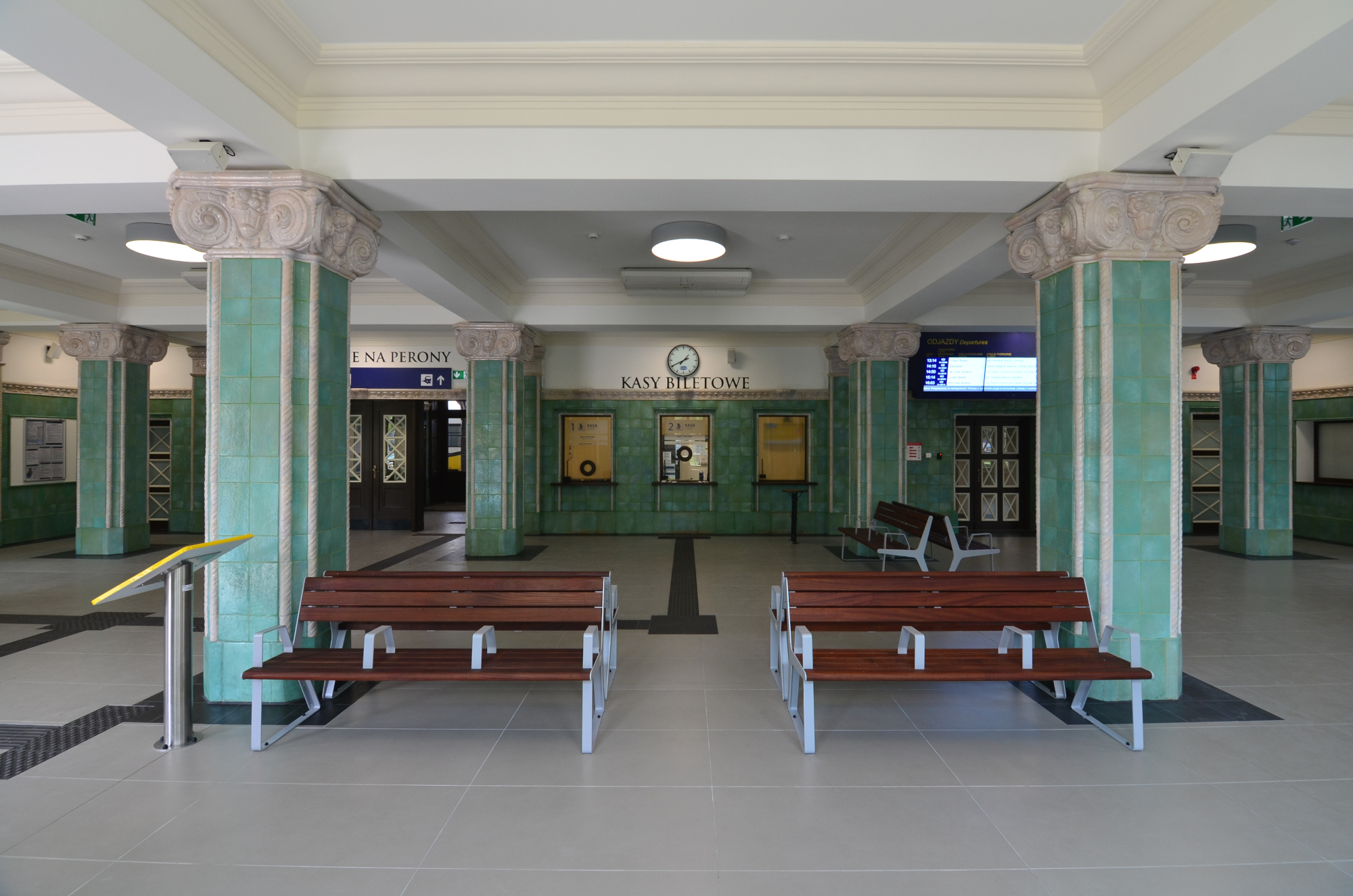 Przestrzeń obsługi podróżnych składa się z obszernego holu, pełniącego jednocześnie funkcje poczekalni. W jego wystroju połączono elementy historyczne z nowoczesnością. Odnowiono zabytkowe wnętrze, poddając konserwacji akwamarynowe płytki znajdujące się na ścianach oraz kolumnach holu oraz ceramiczne detale wieńczące okładzinę i kapitele kolumn. Wnętrze wyposażono w ławki, kosze, gabloty na rozkłady jazdy oraz elektroniczne tablice przyjazdów i odjazdów pociągów, a także nowoczesne oświetlenie, w formie owalnych opraw sufitowych. Strefa obsługi podróżnych (poczekalnia, kasy biletowe, pomieszczenie dla rodziców z dziećmi, toalety) została funkcjonalnie połączona z przestrzenią komercyjną. Znaczną powierzchnię w budynku dworca zajmą również pomieszczenia biurowe przewidziane dla jednostki Sądu Okręgowego w Jeleniej Górze.