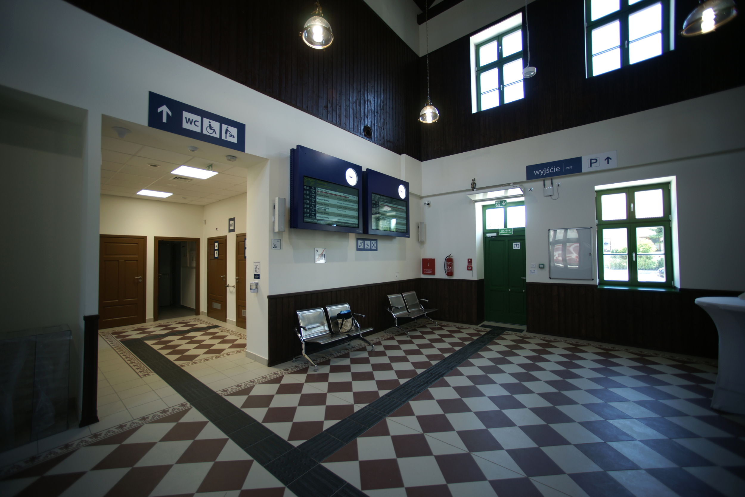 We wnętrzu budynku najważniejszą przestrzenią z punktu widzenia podróżnych jest hol pełniący jednocześnie funkcję poczekalni, w sąsiedztwie którego zlokalizowano toalety, a także powierzchnię, na której w przyszłości będzie działać prowadzona przez samorząd lokalny instytucja społeczno-kulturalna. Wykończenie przestrzeni holu łączy w sobie elementy historyczne ze współczesnymi, co daje interesujący efekt wizualny. Oprócz ławek, gablot na rozkład jazdy, elektronicznych tablic przyjazdów i odjazdów pociągów, systemu informacji głosowej, szczególną uwagę zwraca odtworzona na wzór oryginalnej posadzka ceramiczna złożona z białych i czerwonych płytek układanych w karo z interesującym wzorem ornamentalnym na brzegach. Z kolei ściany pomalowano na kolor jasnego beżu, a w górnej ich części przywrócono obicie wykonane z desek.