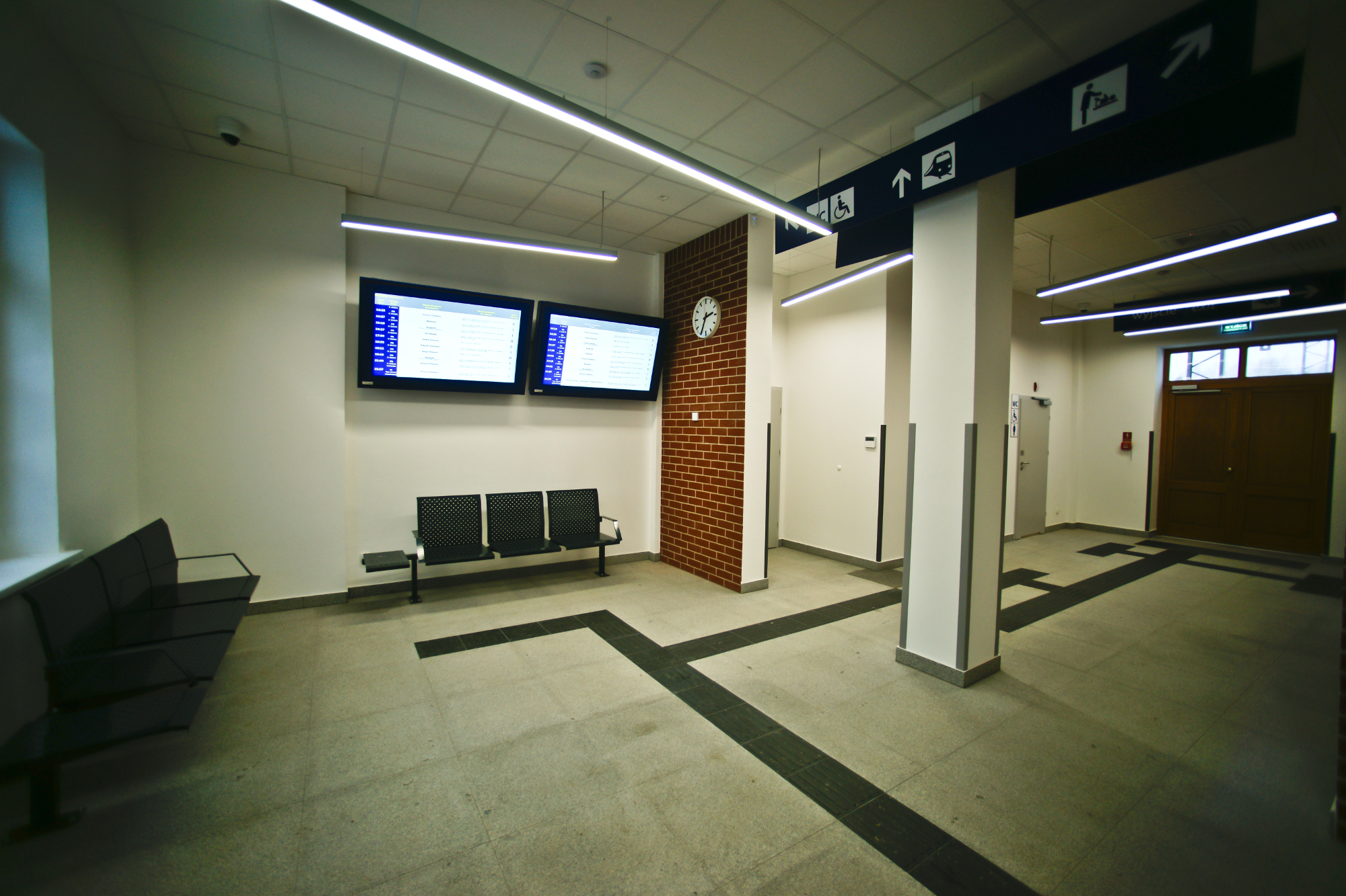 Przebudowa dworca objęła również jego wnętrze. Na parterze znajduje się przestrzeń obsługi podróżnych, a w niej ławki, gabloty na rozkład jazdy, elektroniczne tablice odjazdów i przyjazdów pociągów oraz elementy nowego systemu informacji głosowej. Interesująca jest aranżacja wnętrza. Większość ścian pomalowano na biały kolor, ale nie wszystkie. Na części z nich pozostawiono odkrytą cegłę, co nawiązuje do historycznego wyglądu elewacji obiektu. Nieprzypadkowy jest kolor posadzki. Oparto go o kontrast grafitowych ryflowanych ścieżek prowadzących z granitową posadzką, co jest ułatwieniem wprowadzonym z myślą o osobach niedowidzących. Usprawnień dla osób o ograniczonej sprawności ruchowej jest więcej. Wśród nich znalazły się m.in. mapy dotykowe z planem dworca, tabliczki w alfabecie Braille’a, toalety specjalnie przystosowane do potrzeb osób z niepełnosprawnościami oraz dla opiekunów z dziećmi. Co niezwykle istotne, wyeliminowano również bariery architektoniczne, takie jak wysokie progi czy zbyt wąskie drzwi.