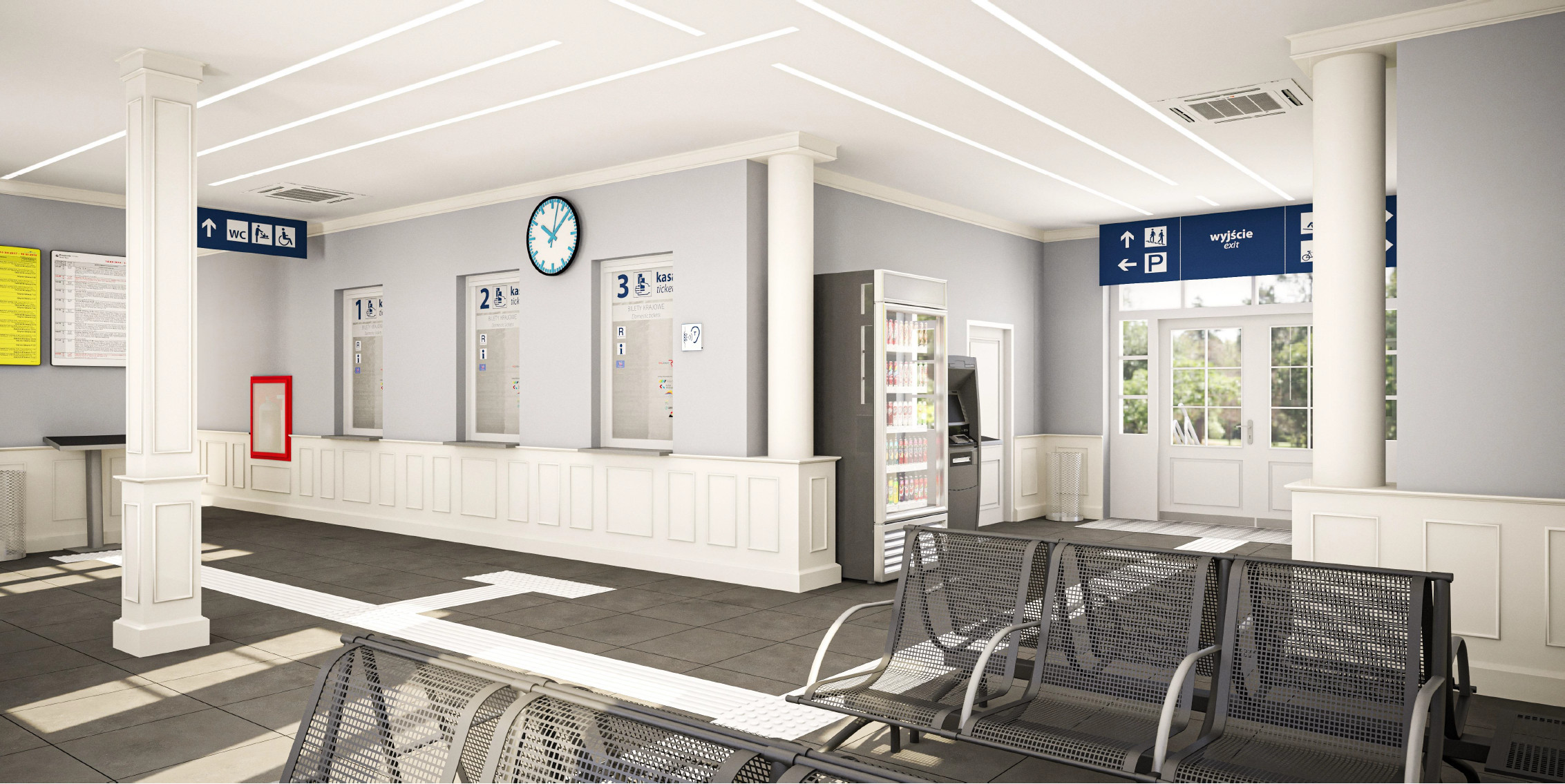 Metamorfozę, z poszanowaniem historycznego charakteru dworca, przejdzie jego wnętrze. Przestrzeń obsługi podróżnych, znajdująca się w centralnej części budynku, połączy w sobie klasycystyczne elementy wystroju z nowoczesnością. Hol pełniący jednocześnie funkcję poczekalni będzie utrzymany w jasnej kolorystyce. Szara posadzka i ściany będą współgrać z bielą drewnianych boazerii i kolumn oraz sufitu, w który wkomponowano liniowe oświetlenie. W holu podróżni znajdą również ergonomiczne ławki, gabloty z rozkładem jazdy, a także elektroniczne tablice przyjazdów i odjazdów pociągów. Przestrzeń obsługi podróżnych będzie klimatyzowana. W jej sąsiedztwie zlokalizowano pomieszczenia kas biletowych oraz toalety. Południowa część dworca będzie przeznaczona na sezonowe kasy biletowe, natomiast w północnej i na piętrze, w centralnej części budynku, zaplanowano lokale na wynajem.