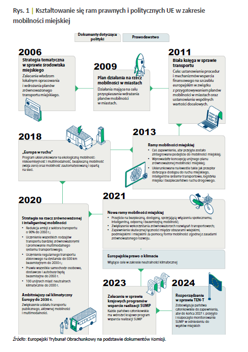 Realizując zalecenia Europejskiego Trybunału Obrachunkowego zawarte w raporcie „Zrównoważona mobilność w miastach w UE – bez zaangażowania ze strony państw członkowskich nie będzie możliwa istotna poprawa” , w grudniu 2021 r. Komisja Europejska w komunikacie „Nowe unijne ramy mobilności miejskiej” przedstawiła kompleksowy zestaw środków mających na celu stworzenie zrównoważonego, inteligentnego i odpornego systemu mobilności miejskiej oraz wprowadzenia zasadniczych zmian niezbędnych do osiągnięcia celów Europejskiego Zielonego Ładu. Zaproponowała m.in. wzmocnione podejście do planów zrównoważonej mobilności miejskiej, nakładając w projekcie zmienionego rozporządzenia w sprawie TEN-T obowiązki w zakresie opracowania i przyjęcia planów zrównoważonej mobilności miejskiej na ustanowione węzły miejskie, w powiązaniu z obowiązkiem gromadzenia i monitorowania szczegółowych wskaźników mobilności miejskiej. Wezwała ponadto każde państwo członkowskie do wprowadzenia krajowego, długoterminowego programu wsparcia realizacji planów zrównoważonej mobilności miejskiej, z krajowym kierownikiem programu na czele. Program ten mógłby obejmować środki prawne, finansowe i organizacyjne mające na celu pomoc w budowaniu zdolności i wdrażaniu planów zrównoważonej mobilności miejskiej zgodnie z europejskimi wytycznymi dotyczącymi tych planów.