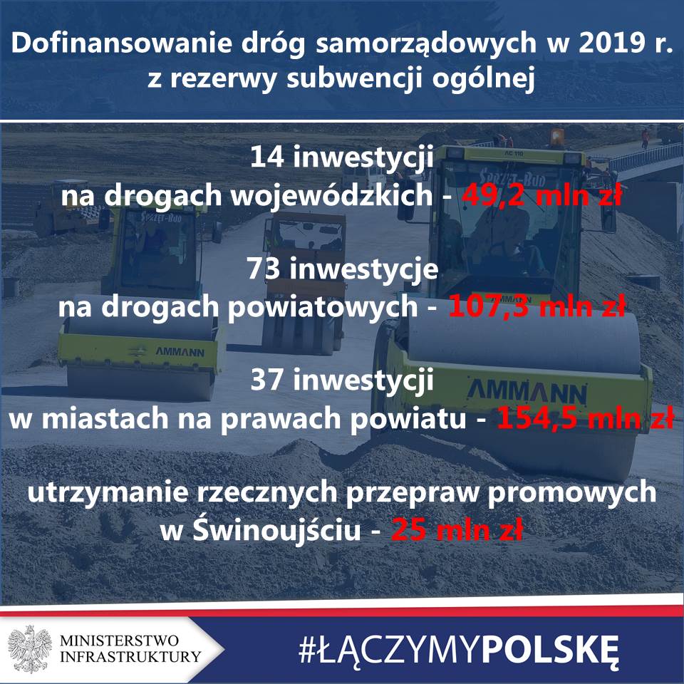 Komisja Wspólna Rządu i Samorządu Terytorialnego zaakceptowała zaproponowane przez Ministerstwo Infrastruktury i uzgodnione z Ministerstwem Finansów zasady podziału środków z rezerwy subwencji ogólnej na 2019 rok.