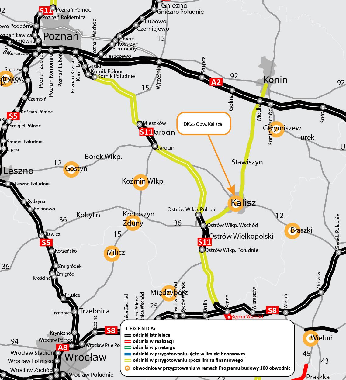 Dobiegają końca prace analityczne dotyczące możliwych przebiegów drogi krajowej nr 25, który zostanie ostatecznie określony w decyzji środowiskowej. Ogłoszenie przetargu na wybór wykonawcy obwodnicy Kalisza jest planowane w II kw. 2022 r. Rozpoczęcie budowy obwodnicy w systemie Projektuj i buduj przewidziano na 2024 r.