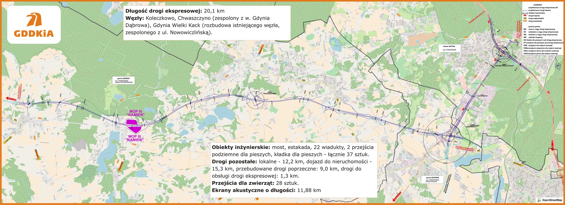 Trasa połączy Szemud z istniejącą obwodnicą Trójmiasta poprzez węzeł Gdynia Wielki Kack. Powstanie łącznie 20 kilometrów drogi ekspresowej wraz z trzema węzłami: mniejszym w Koleczkowie i dwoma dużymi, zespolonymi w Chwaszczynie oraz Gdyni Wielkim Kacku. Trasa będzie miała po dwa pasy ruchu w każdym kierunku i pas awaryjny, a na odcinku Chwaszczyno – Gdynia Wielki Kack oraz na odcinku Obwodnicy Trójmiasta w obrębie węzła Gdynia Wielki Kack będą to po trzy pasy na długości ok. 2,9 km.