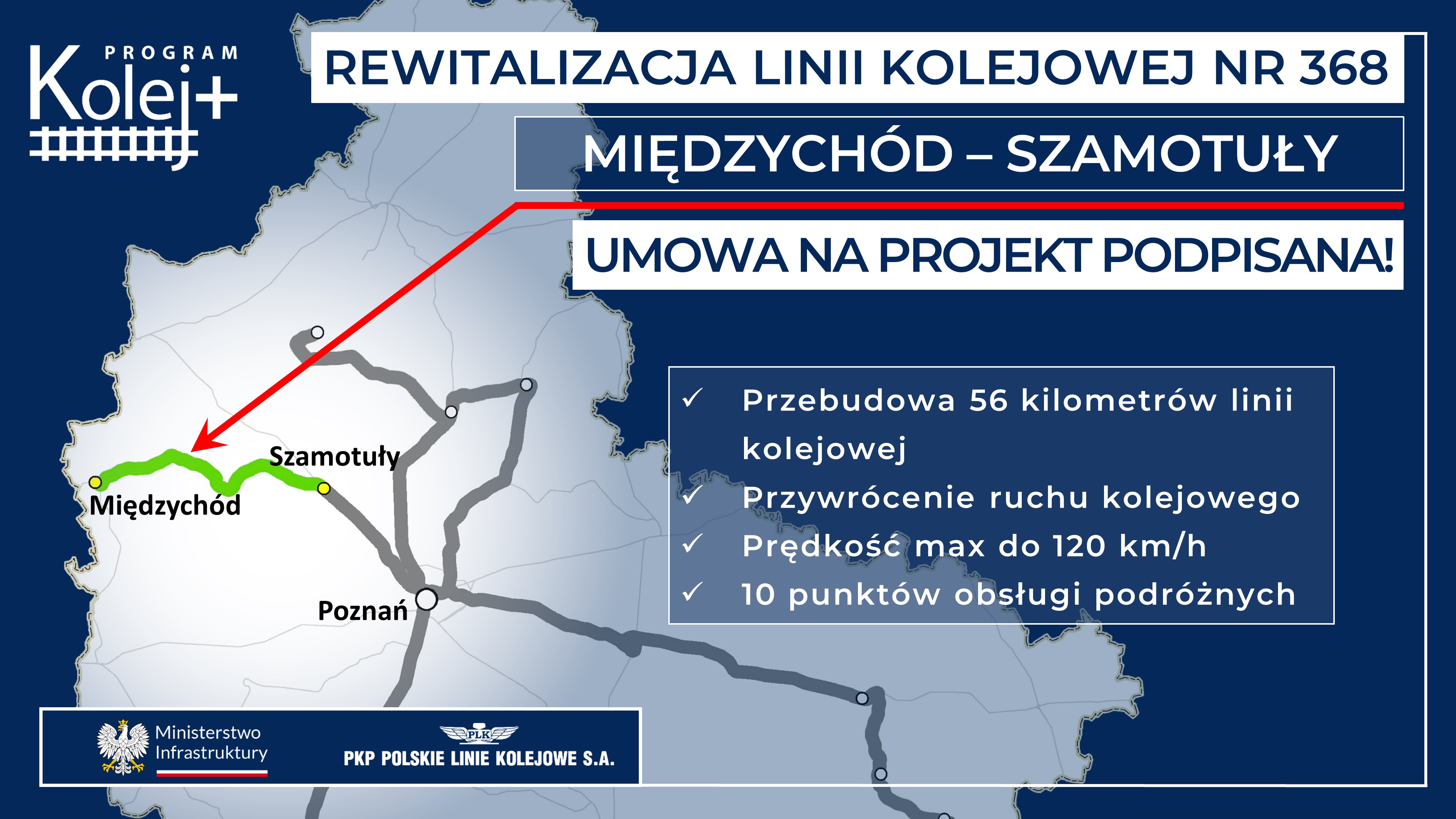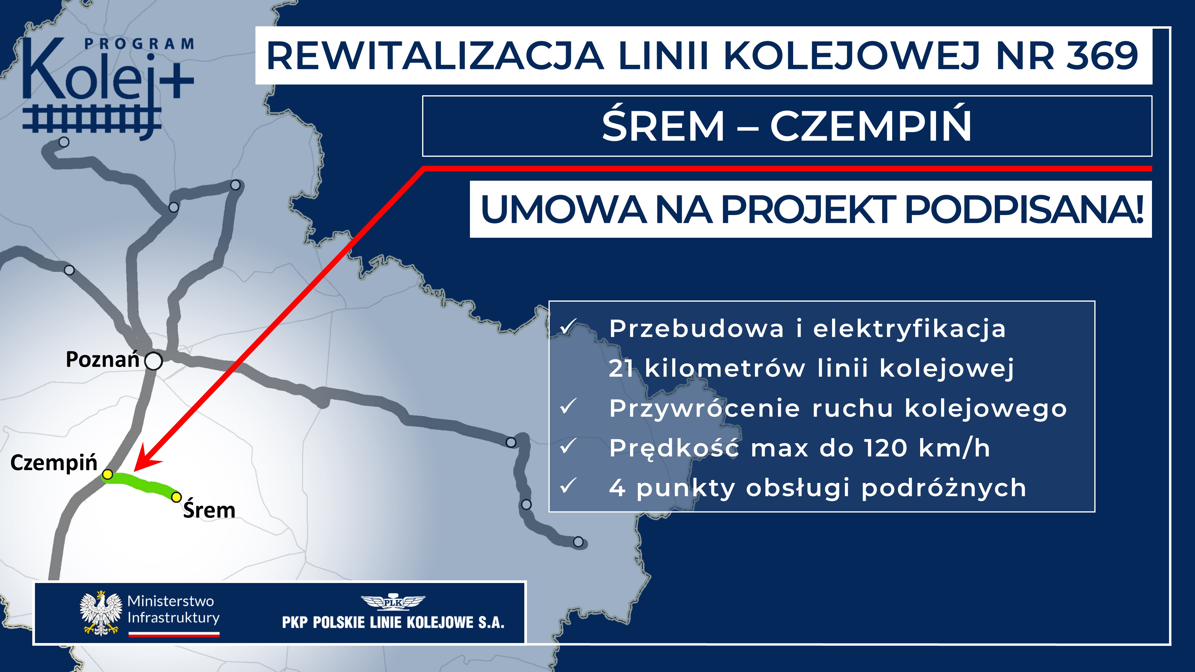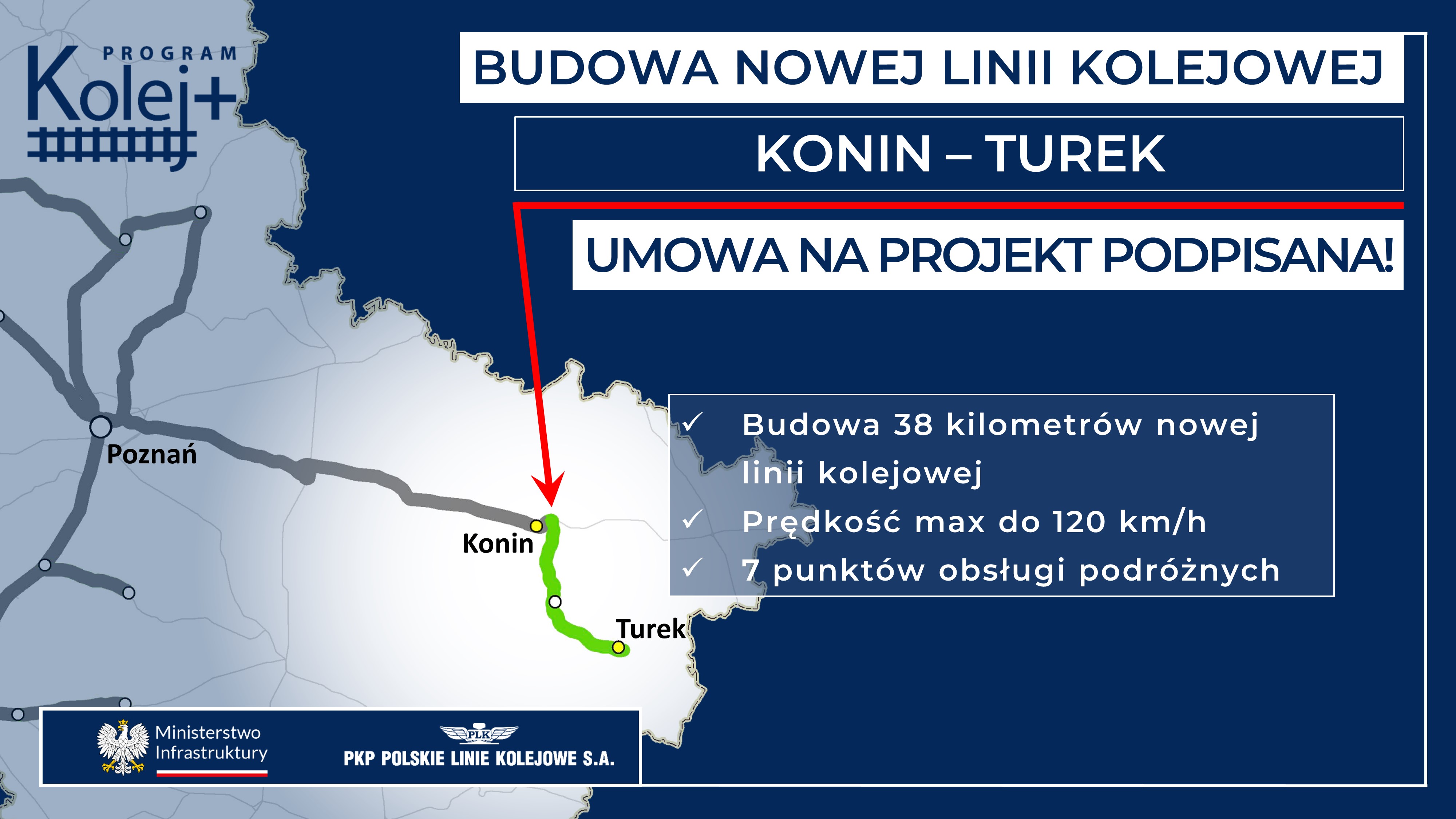 PKP PLK SA podpisały umowy na opracowanie dokumentacji projektowej z Rządowego Programu Uzupełniania Lokalnej i Regionalnej Infrastruktury Kolejowej Kolej Plus do 2029 r. na: budowę nowej linii Turek – Konin z wykonawcą Multiconsult Polska Sp. z o.o. za ok. 13, 7 mln zł oraz na rewitalizację trasy Międzychód – Szamotuły z BBF Sp. z o.o. za ok. 7,9 mln zł i Śrem – Czempiń z Konsorcjum firm Mosty Katowice Sp. z o.o. & Arcadis Sp. z o.o. za ok. 9,7 mln zł. Jednocześnie w umowach przewidziano opcje nadzoru autorskiego, z której zamawiający może skorzystać w trakcie realizacji projektu i już po przygotowywaniu dokumentacji projektowej. Zakończenie prac nad dokumentacją dla wszystkich projektów przewidywane jest w 2026 r., a zakończenie robót budowlanych na przełomie 2028 i 2029 r.
