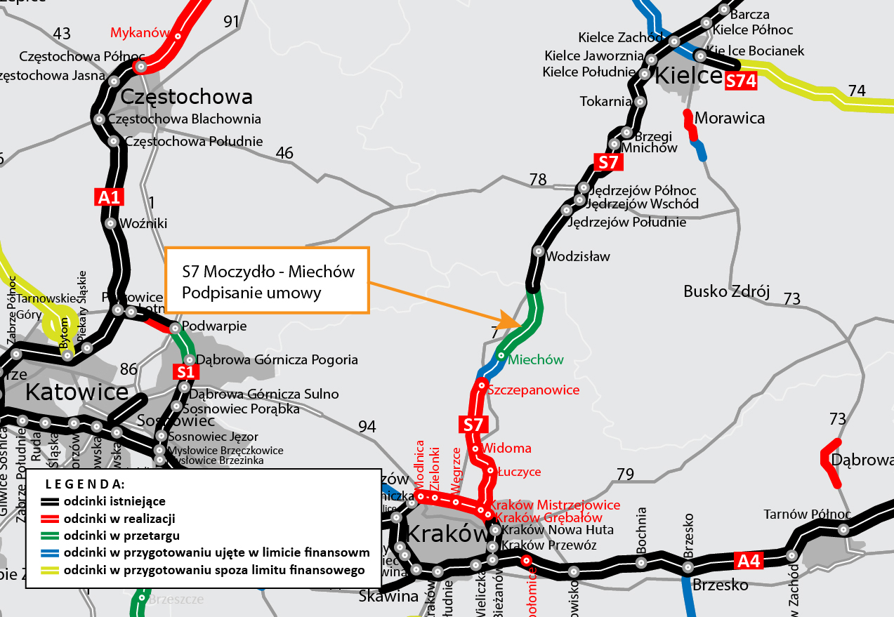 Generalna Dyrekcja Dróg Krajowych i Autostrad podpisała 16 kwietnia 2020 r. umowę na kontynuację projektowania i budowę 18,7 km odcinka drogi ekspresowej S7 od granicy województwa świętokrzyskiego (Moczydło) do węzła Miechów. Wartość umowy to 752,9 mln zł.