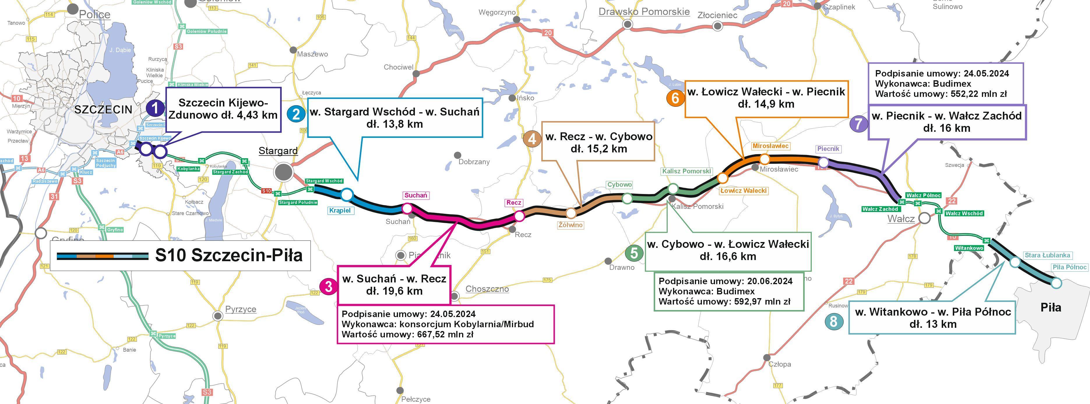 Generalna Dyrekcja Dróg Krajowych i Autostrad zawarła 20 czerwca 2024 r. umowy na realizację odcinka drogi ekspresowej S10 Cybowo – Łowicz Wałecki oraz obwodnicy Rusinowa w ciągu DK22. Obie inwestycje zrealizuje w formule Projektuj i buduj firma Budimex. Pierwsza umowa dotyczy odcinka trasy ekspresowej o długości 16 km i wartości 592,17 mln zł, a druga obwodnicy o długości 4,5 km i wartości 54,98 mln zł.