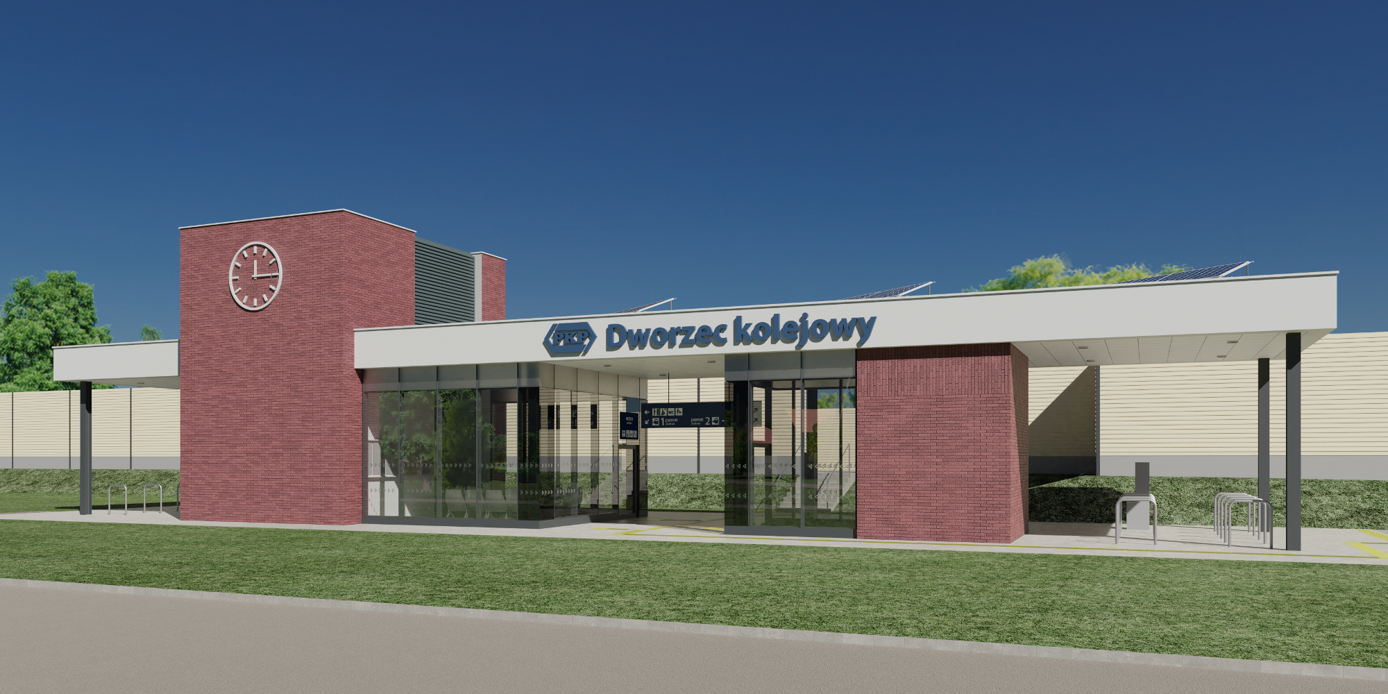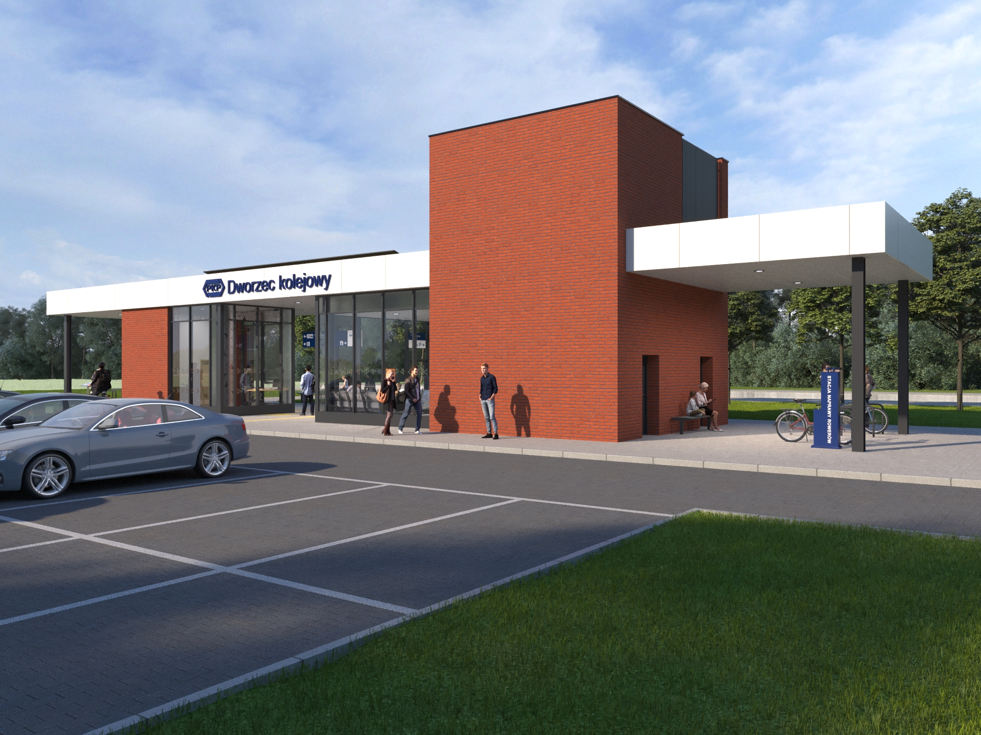 Nowe budynki stacyjne powstaną jako obiekty typowe. Będą posiadać nowoczesną, minimalistyczną i funkcjonalną formę architektoniczną. Pod wiatą zlokalizowane zostaną dwa minipawilony. Mieszczą one część pasażerską, gdzie zaprojektowano poczekalnię (wyposażoną m.in. w ławki, gabloty, elektroniczne tablice przyjazdów i odjazdów pociągów, system informacji głosowej) i toalety oraz część handlowo-usługową. Pod zadaszeniem zlokalizowano również ławki dla podróżnych, a także stojaki rowerowe wraz ze stacją naprawy jednośladów. Dominantą obydwóch obiektów będzie wieża zegarowa o wysokości 8 metrów. Jej elewacja zostanie wykończona czerwoną rustykalną płytką klinkierową z charakterystycznymi wgłębieniami oraz zadrapaniami. Z kolei pawilony będą niemal w całości przeszklone. Dzięki temu w poczekalniach i częściach przeznaczonych pod lokal handlowo-usługowy zapewniono nie tylko odpowiedni dostęp światła dziennego, ale uwzględniono współczesne trendy w architekturze.