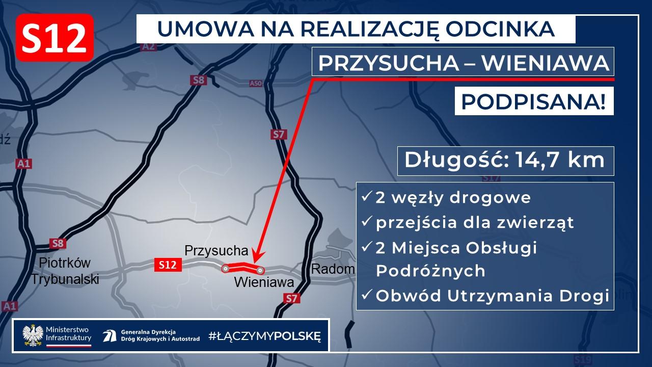 Odcinek S12 o długości 14,7 km to fragment trasy, która docelowo połączy autostradę A1 w okolicach Piotrkowa Trybunalskiego ze wschodnią granicą państwa w Dorohusku. Nowa droga pomiędzy Przysuchą i Wieniawą znacząco poprawi układ komunikacyjny Ziemi Łódzkiej i południowego Mazowsza. Po wybudowaniu S12 przejmie ruch tranzytowy z zatłoczonej DK12 biegnącej przez liczne wsie i miasta. Średni dobowy ruch na tej trasie między Piotrkowem Trybunalskim a Radomiem waha się od blisko 10 tysięcy w okolicy Radomia, do prawie 25 tysięcy w rejonie Piotrkowa Trybunalskiego.