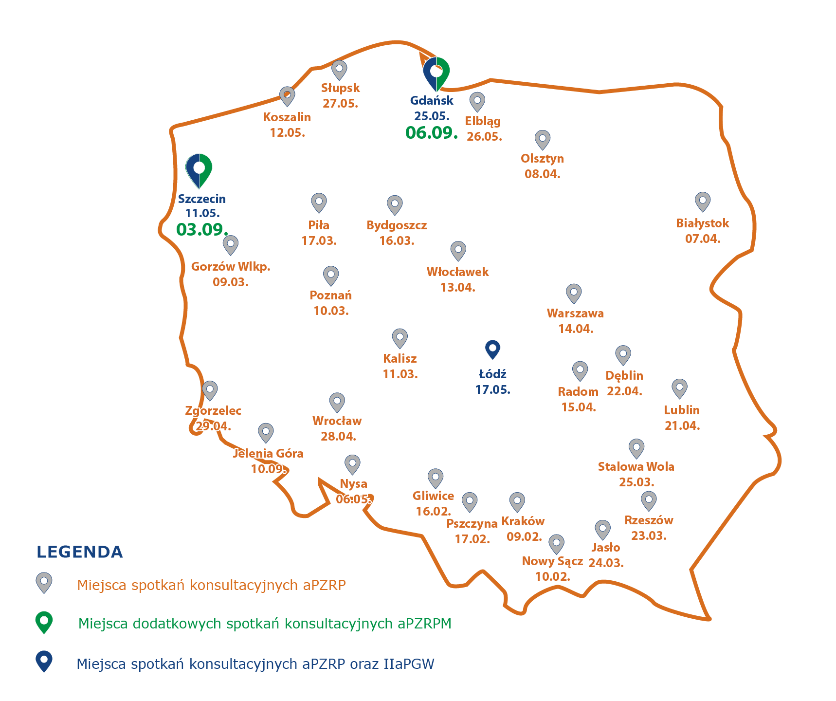 Zapraszamy również na spotkania konsultacyjne, które odbędą się w 28 miastach w całym kraju. Ważnym elementem spotkań będzie przedstawienie ogólnych założeń metodycznych oraz wniosków z przeprowadzonych prac analitycznych dotyczących działań służących ochronie mieszkańców, gospodarki oraz środowiska i dziedzictwa kulturowego na obszarach poszczególnych dorzeczy. Miejsca oraz terminy konsultacji społecznych aPZRP przedstawia mapa w załączniku.