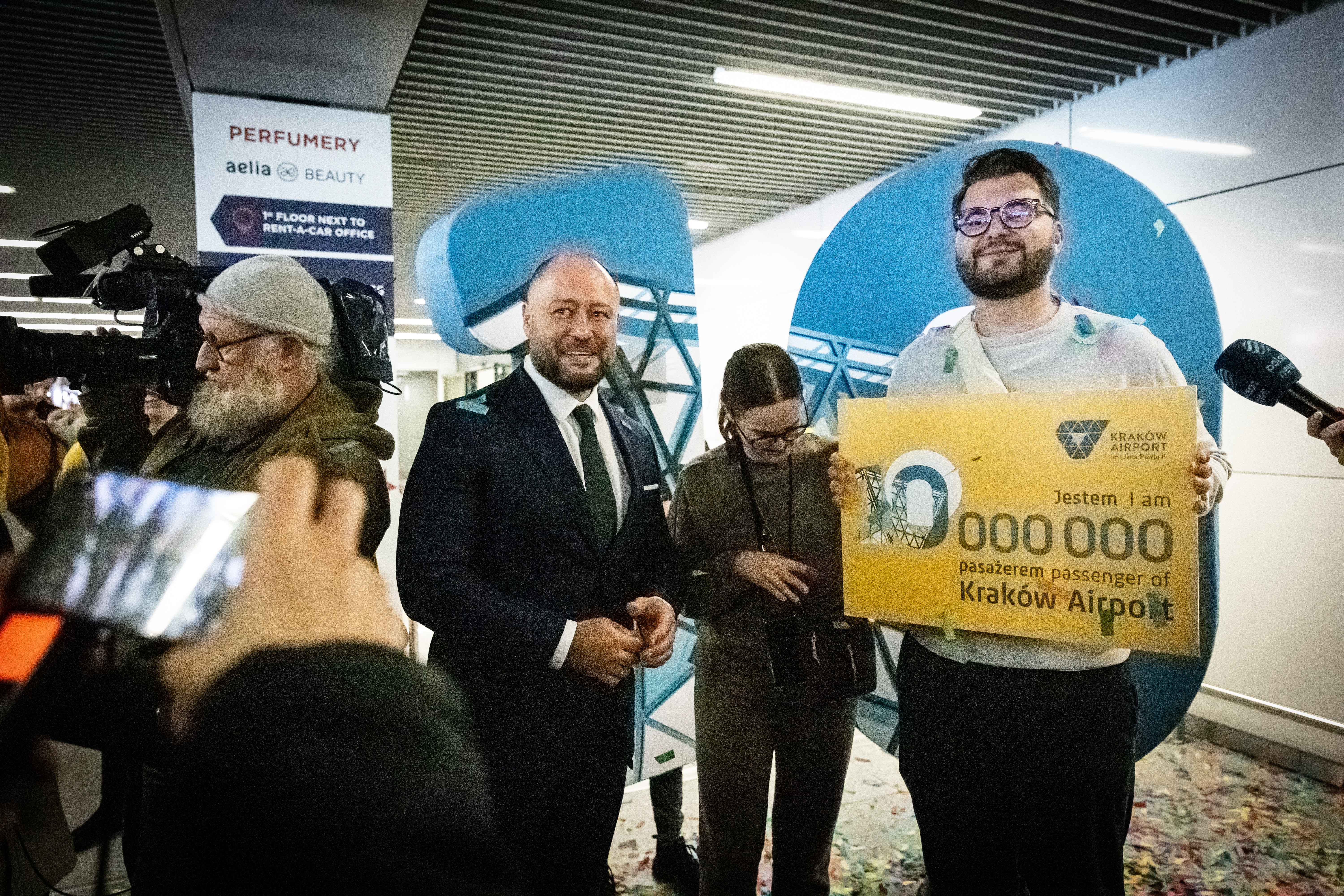 23 listopada 2024 r. Kraków Airport w Balicach zapisał się na kartach historii jako pierwszy port regionalny w Polsce, który obsłużył 10 milionów pasażerów w ciągu jednego roku. Jubileuszowy pasażer przyleciał rejsem PLL LOT z Tokio przez Warszawę. Pan Mateusz jest Krakowianinem i wracał z żoną Ewą z podróży poślubnej. Na lotnisku czekało na niego wiele niespodzianek. Odebrał też gratulacje od ministra infrastruktury Dariusza Klimczaka.