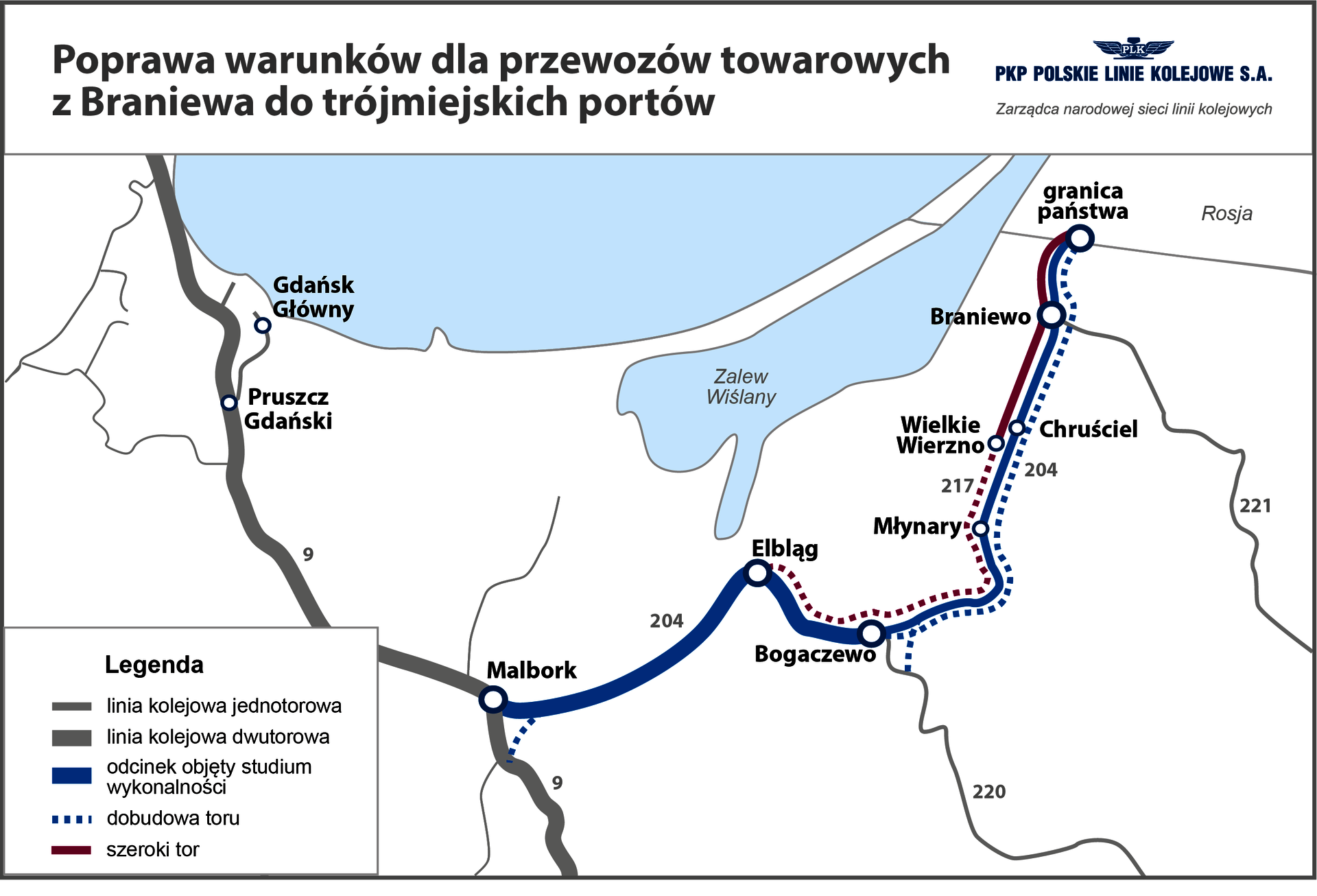 Studium wykonalności dotyczy przebudowy linii kolejowej nr 204 na odcinku ok. 90 km pomiędzy Obwodem Kaliningradzkim, Braniewem, Bogaczewem a Malborkiem. Istotne będzie dostosowanie linii do wymagań międzynarodowych korytarzy TEN-T.