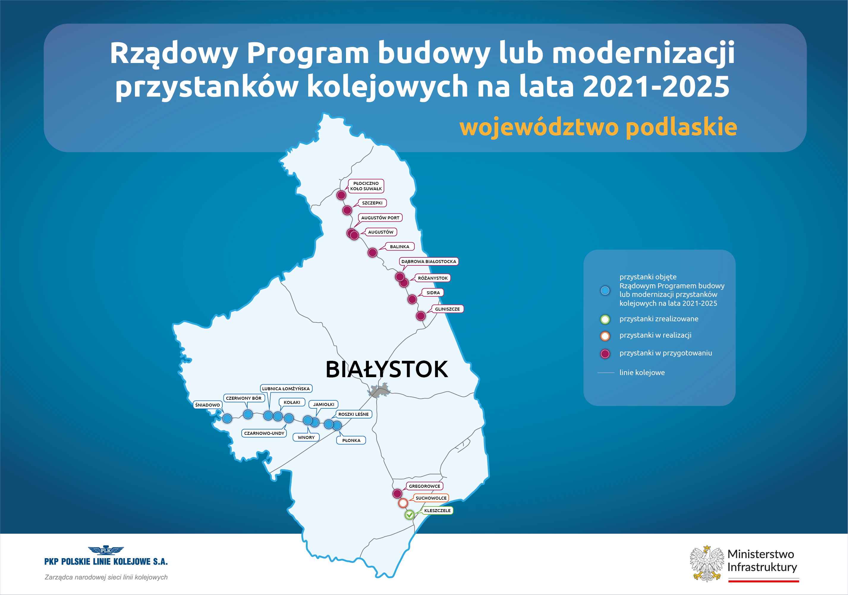 Mieszkańcy podlaskich Kleszczel mogą już skorzystać podróżując koleją z nowego peronu w kierunku Białegostoku i Czeremchy. W województwie podlaskim kolej będzie dostępniejsza m.in. dzięki inwestycjom realizowanym z Rządowego programu budowy lub modernizacji przystanków kolejowych na lata 2021–2025. Kolejne przedsięwzięcia prowadzone przez PKP Polskie Linie Kolejowe SA korzystnie zmieniają 12 przystanków.