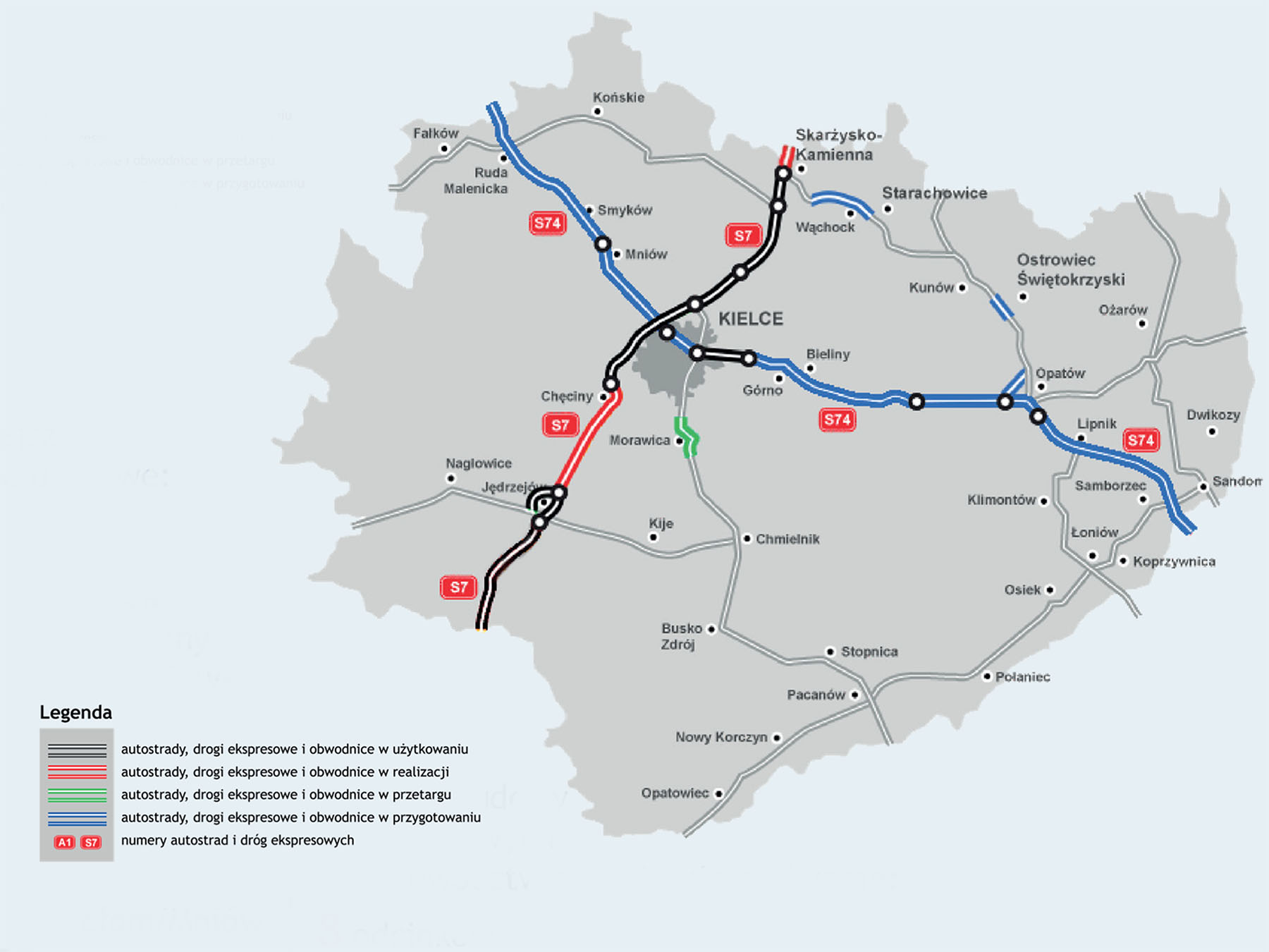 W przygotowaniu są również inwestycje drogowe takie jak budowa obwodnicy Opatowa o długości 19,6 km, obwodnicy Ostrowca Świętokrzyskiego o długości 2,7 km czy drogi S74 Przełom/Mniów – Kielce (DK73) o długości 21 km.