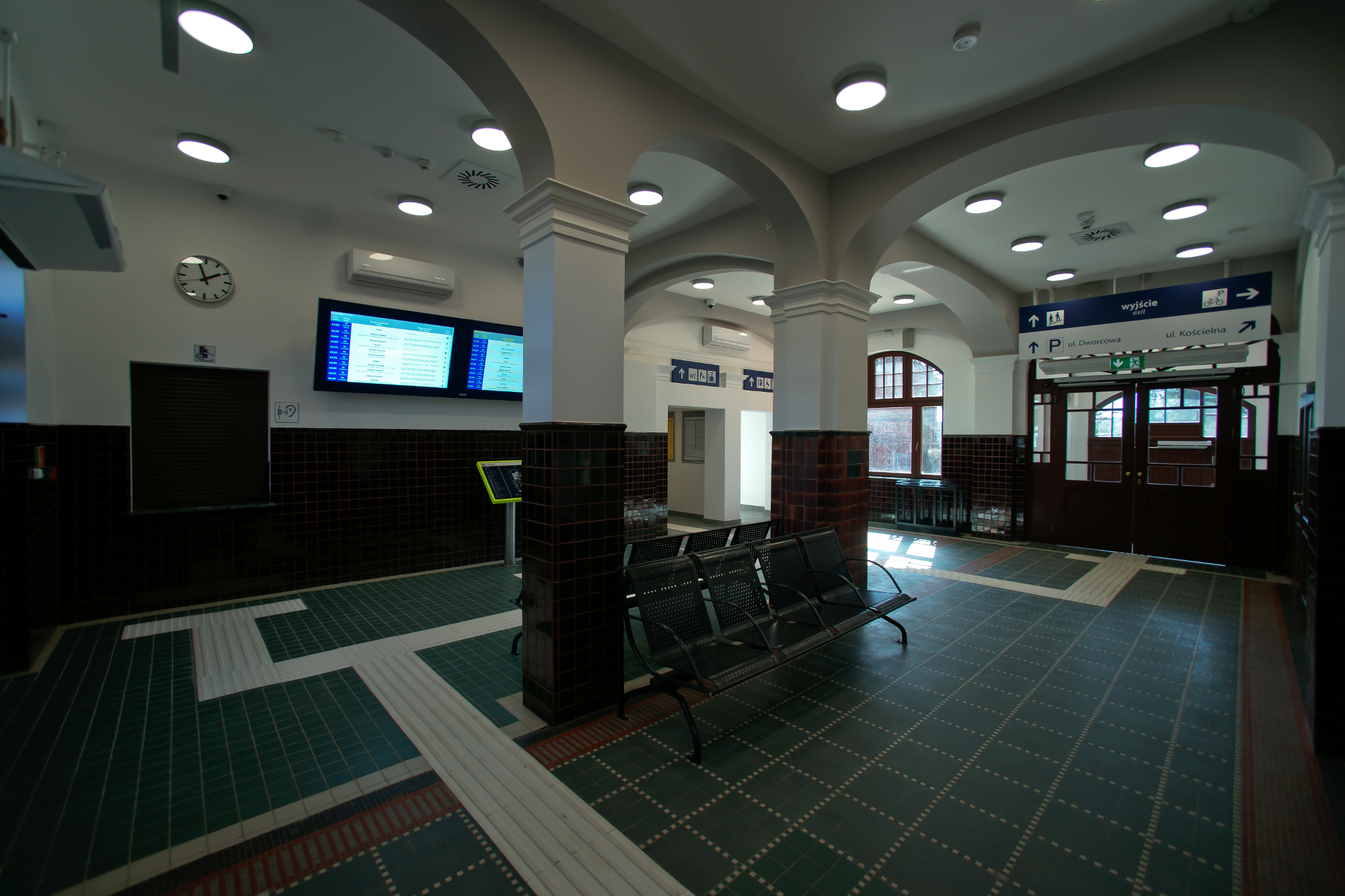 Przebudowa dworca objęła również jego wnętrze. Na parterze zaprojektowano przestrzeń obsługi podróżnych, czyli pomieszczenia kas biletowych, toalet oraz hol – poczekalnię. Podróżni znajdą w nim ławki, gabloty z rozkładem jazdy, elektroniczne tablice odjazdów i przyjazdów pociągów oraz nowy system informacji głosowej. Ciekawostką w tej przestrzeni jest pozostawienie oryginalnych łuków między kolumnami oraz posadzki ceramicznej wykonanej z bardzo drobnych, głównie niebieskich i białych elementów, w którą wkomponowano ścieżki dotykowe dla osób niedowidzących lub niewidomych.
