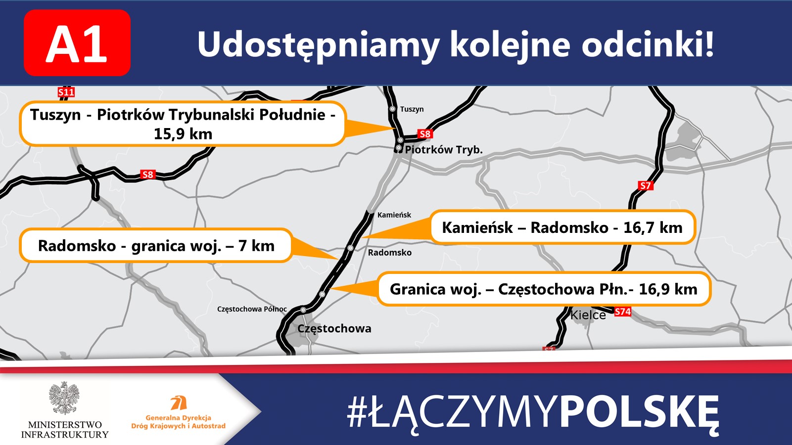 Do dyspozycji kierowców zostały oddane kolejne odcinki autostrady A1 między Tuszynem a początkiem obwodnicy Częstochowy o długości blisko 60 km. Na większości trasy można już korzystać z docelowego układu dwóch jezdni po trzy pasy ruchu.