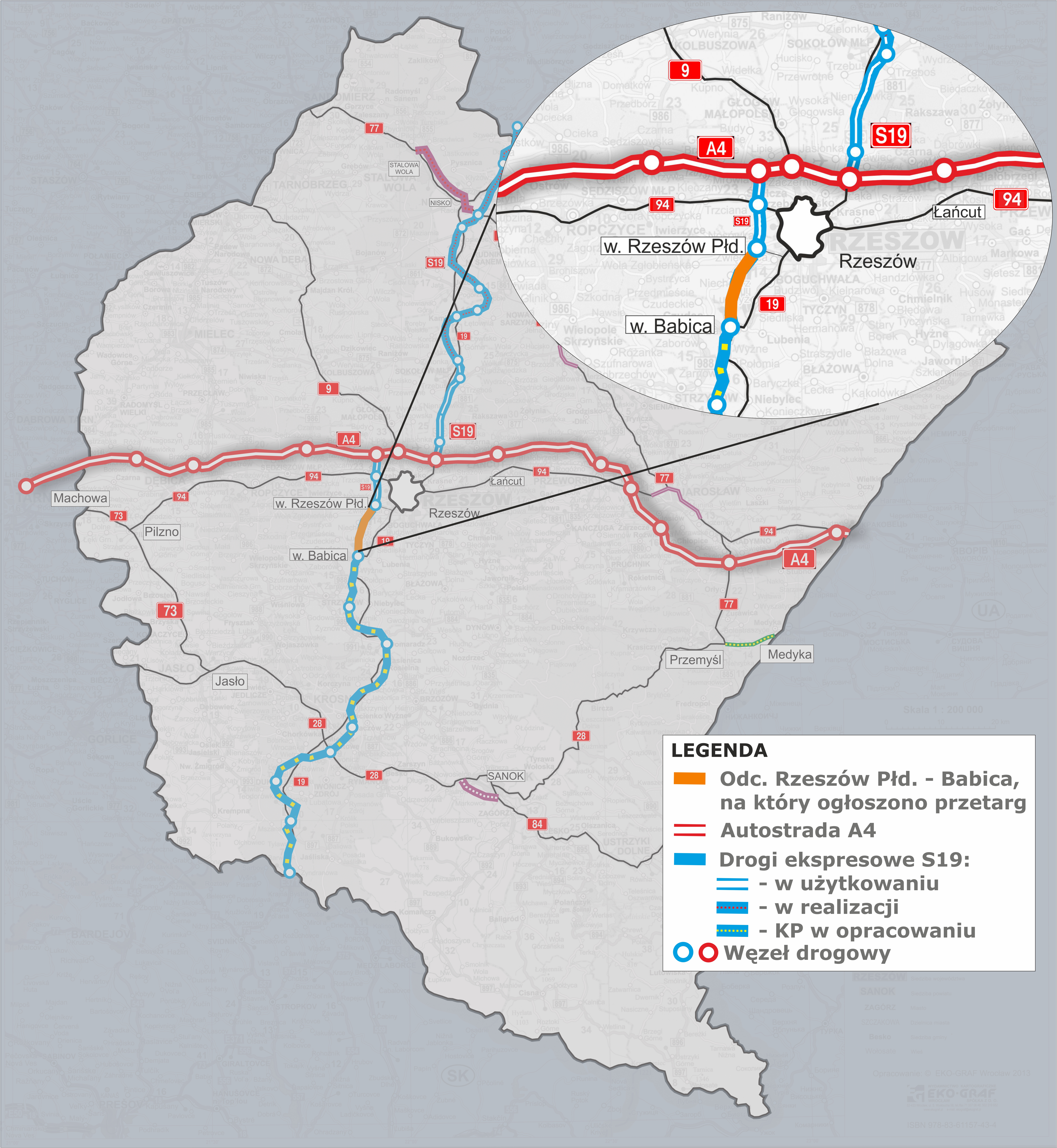 Droga ekspresowa S19 Rzeszów Południe (Kielanówka) - Babica to część międzynarodowej trasy Via Carpatia. Obecnie na Podkarpaciu w realizacji jest 6 odcinków drogi ekspresowej S19 od granicy z województwem lubelskim do Sokołowa Małopolskiego o łącznej długości 54,2 km. W przygotowaniu jest kolejne 85 km od w. Rzeszów Południe do granicy państwa w Barwinku. Dla pierwszego odcinka, na realizację którego ogłoszono dziś przetarg, została już zatwierdzona koncepcja programowa. Na pozostałych 4 odcinkach wykonawcy pracują nad rozwiązaniami projektowymi, przygotowując koncepcje programowe.