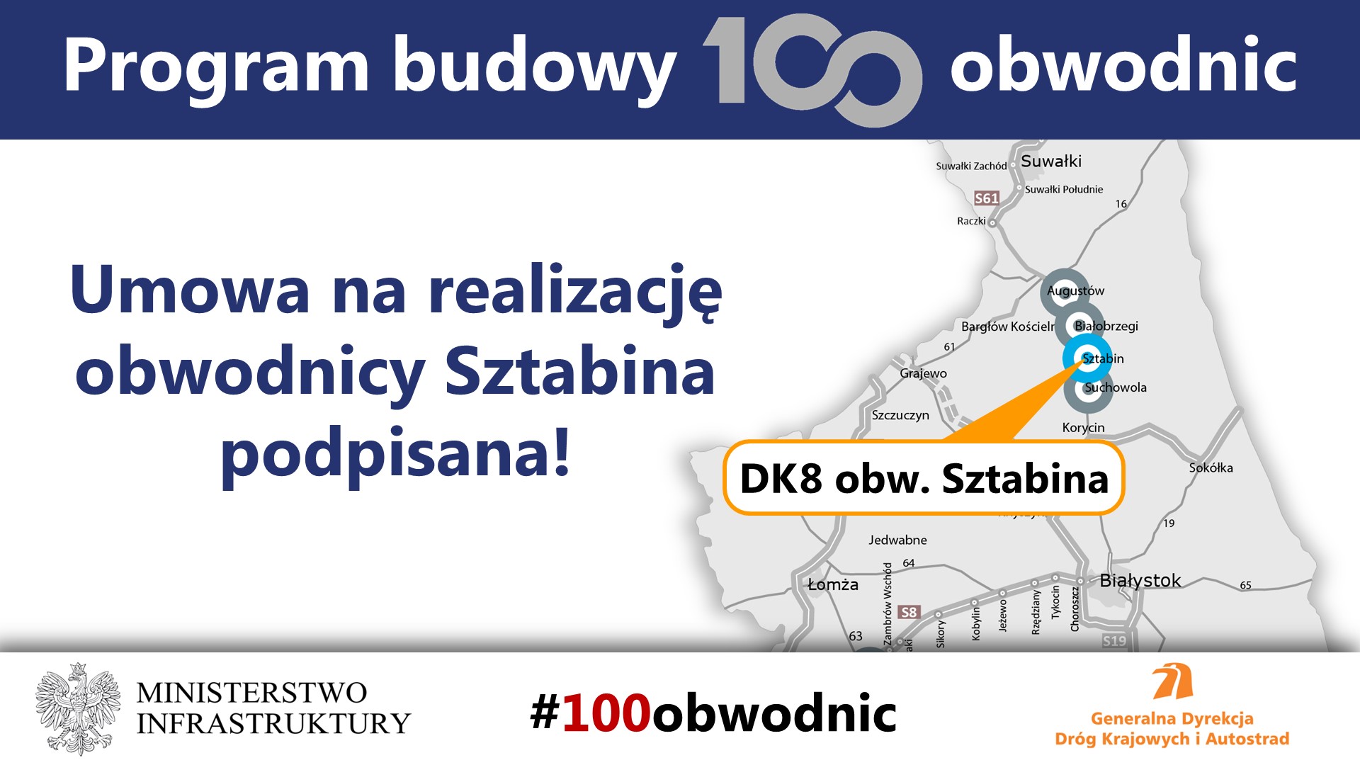 Obwodnica Sztabina będzie częścią drogi krajowej nr 8 i ominie Sztabin od strony wschodniej. Tym samym wyprowadzi ruch tranzytowy poza centrum tej miejscowości, co zdecydowanie poprawi komfort życia mieszkańców. Rozpocznie się kilometr na południe od miasta, rondem zlokalizowanym przed rzeką Biebrza. Zakończenie obwodnicy zlokalizowane będzie ok. dwa kilometry na północ od Sztabina, włączeniem w istniejącą drogę krajową nr 8 na wysokości zjazdu do miejscowości Ewy.