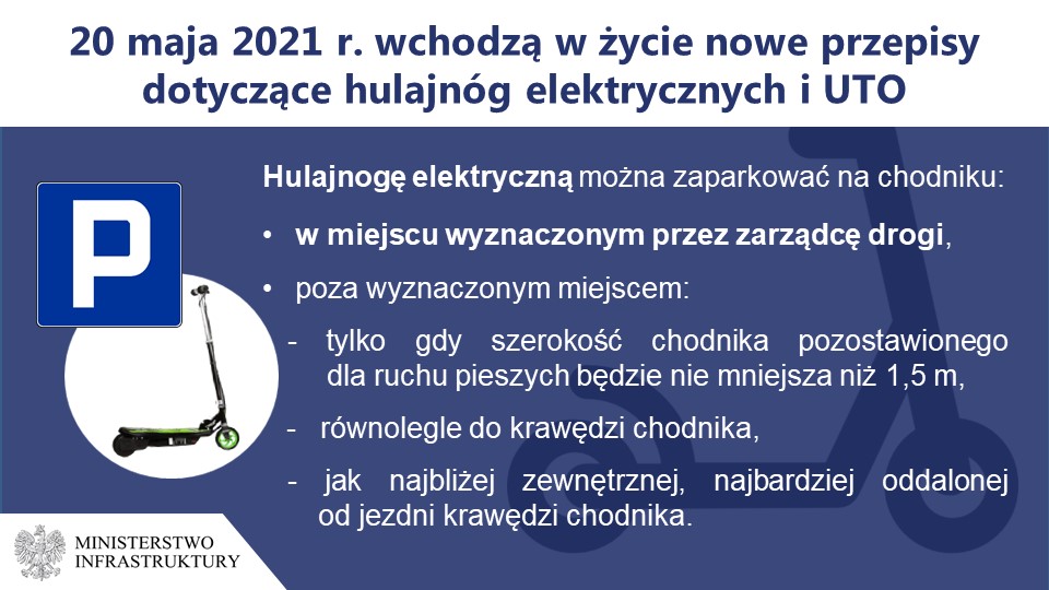 20 maja 2021 r. wejdą w życie przepisy nowelizacji ustawy Prawo o ruchu drogowym oraz niektórych innych ustaw, która reguluje status prawny urządzeń napędzanych elektrycznie oraz urządzeń napędzanych siłą mięśni przeznaczonych do poruszania się po drogach publicznych. Ustawa wprowadza pierwszeństwo pieszego w stosunku do kierującego hulajnogą elektryczną lub urządzeniem transportu osobistego (UTO) poruszającego się po części infrastruktury przeznaczonej dla ruchu pieszych. Kierujący tymi pojazdami będą zobowiązani do ustępowania pierwszeństwa pieszym i nieutrudniania im ruchu.