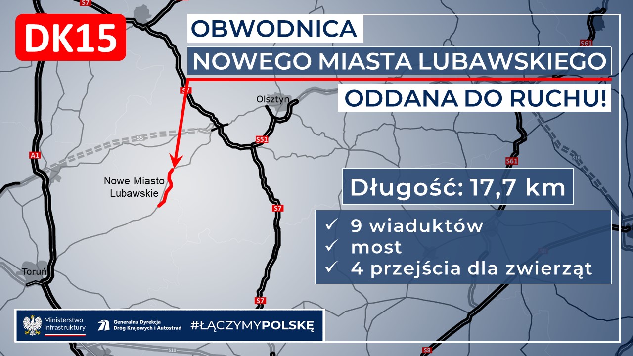21 grudnia 2022 r. została udostępniona kierowcom obwodnica Nowego Miasta Lubawskiego w ciągu drogi krajowej nr 15.