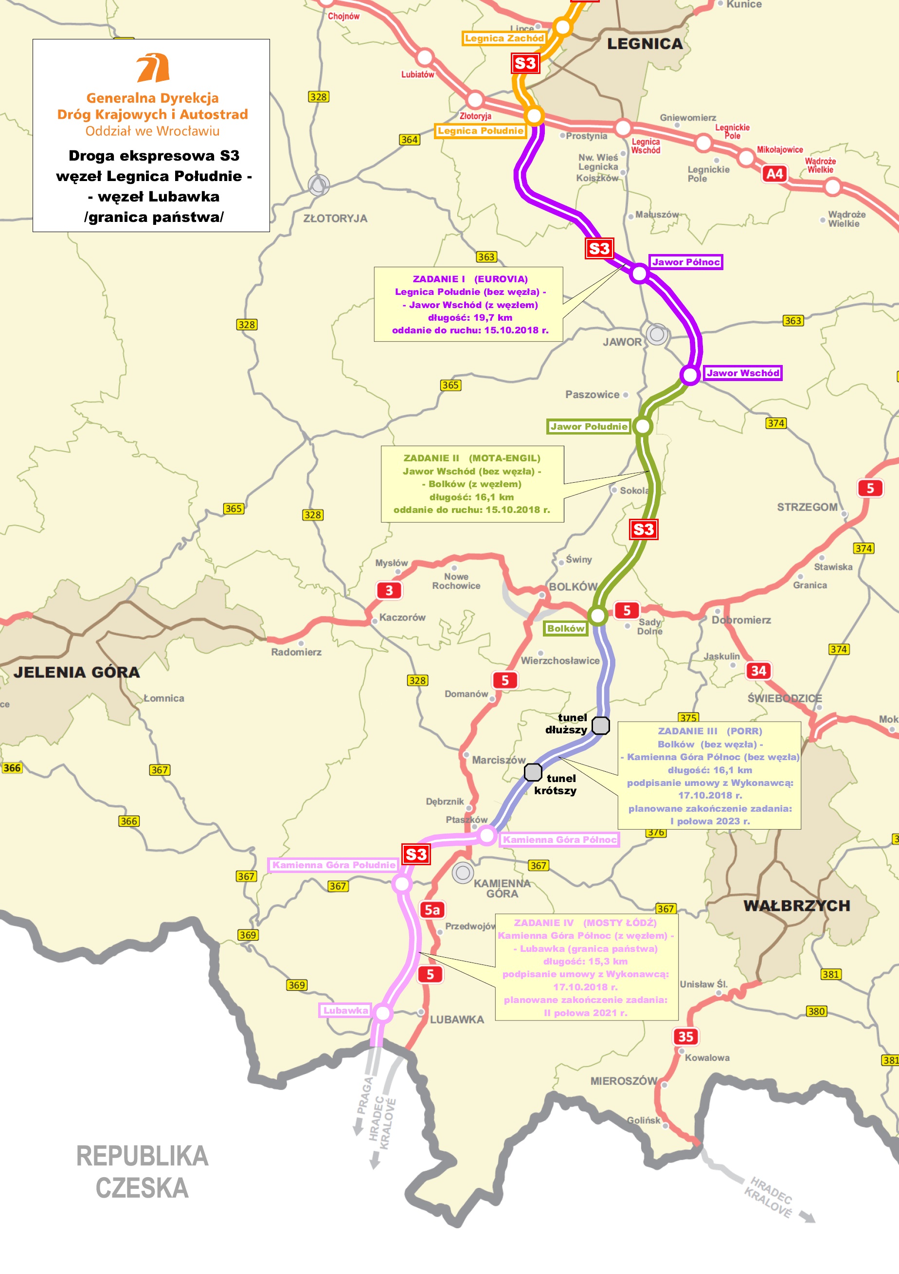 Realizację ostatniego fragmentu S3 podzielono na dwa odcinki. Trasę pomiędzy węzłami Bolków i Kamienna Góra Północ zaprojektuje i zbuduje konsorcjum firm: PORR z Warszawy i PORR Bau z Wiednia. Ponad 16-kilometrowy odcinek będzie przebiegać przez pasmo Gór Wałbrzyskich a S3 pobiegnie pod nimi dwoma tunelami. W ramach tego zadania powstanie najdłuższy tunel drogowy w Polsce o długości ok. 2300 m, natomiast drugi tunel będzie miał ok. 320 m długości. Koszt budowy tego odcinka to ponad 1,5 mld zł, jego oddanie do ruchu jest planowane w pierwszej połowie 2023 r. Wcześniej, w drugiej połowie 2021 r., kierowcy skorzystają z przygranicznego odcinka S3 od węzła Kamienna Góra Północ do węzła Lubawka o długości ok. 15,3 km. Zrealizuje go konsorcjum: Mosty Łódź i Przedsiębiorstwo Budownictwa Drogowo-Inżynieryjnego z Torunia za prawie 880 mln zł.