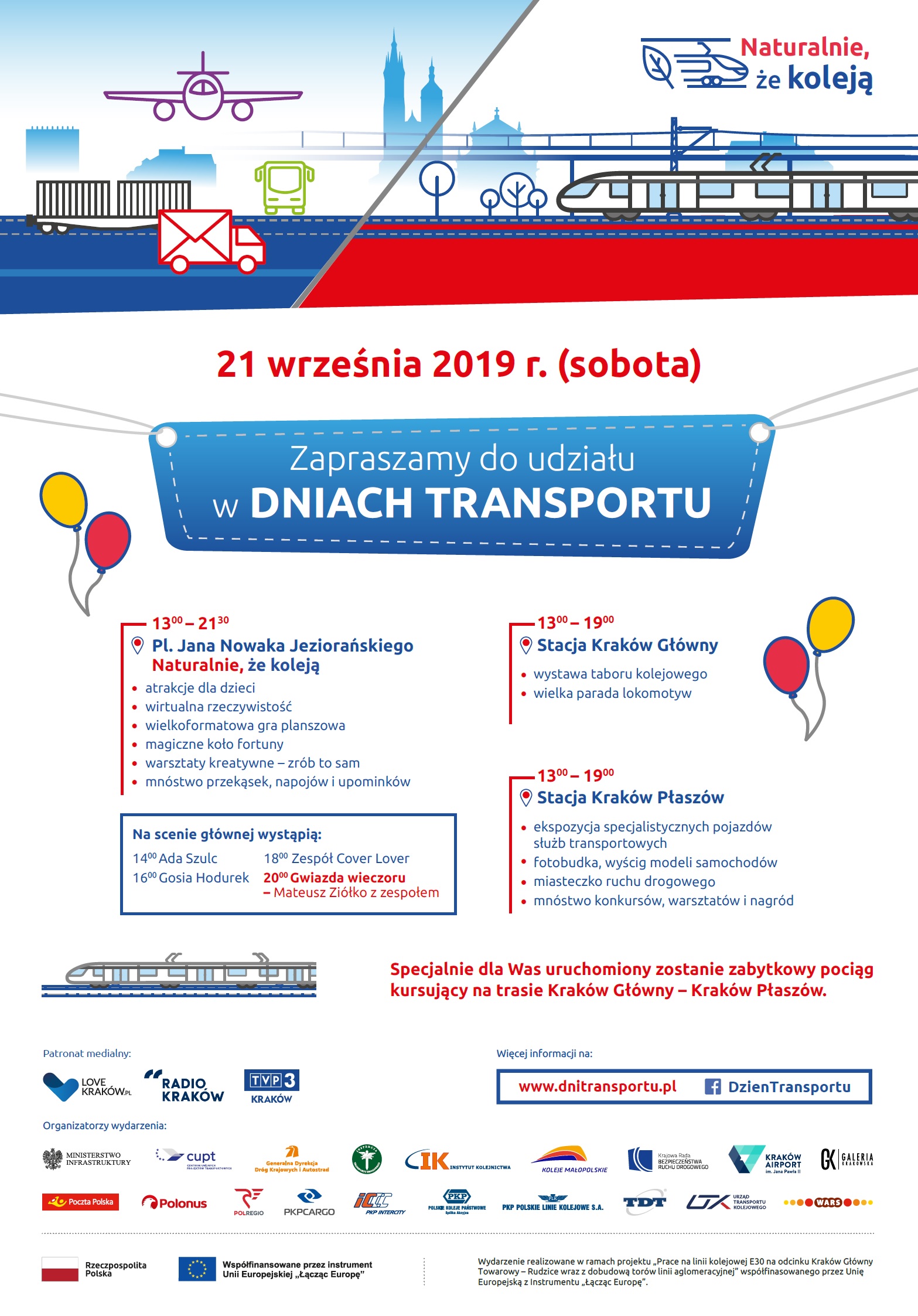 W programie na stacji Kraków Płaszów zaplanowano m.in. pokazy Grupy Operacyjno-Interwencyjnej Straży Ochrony Kolei, warsztaty z programowania tras pociągów, test siły głosu na decybelomierzu oraz tempa reakcji i utrzymania równowagi, mini miasteczko kolejowe, miasteczko ruchu drogowego, ekspozycję specjalistycznych pojazdów służb transportowych, wyścigi modeli samochodów, symulator jazdy autobusem w wirtualnej rzeczywistości, a także mnóstwo konkursów z nagrodami.