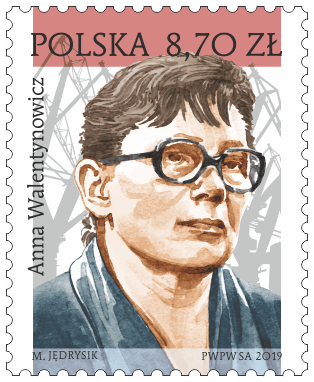 Znaczek obiegowy z wizerunkiem Anny Walentynowicz, która została przedstawiona na tle stoczniowych dźwigów, został wprowadzony do obiegu w nakładzie 1 mln sztuk. Jego autorem jest Maciej Jędrysik.