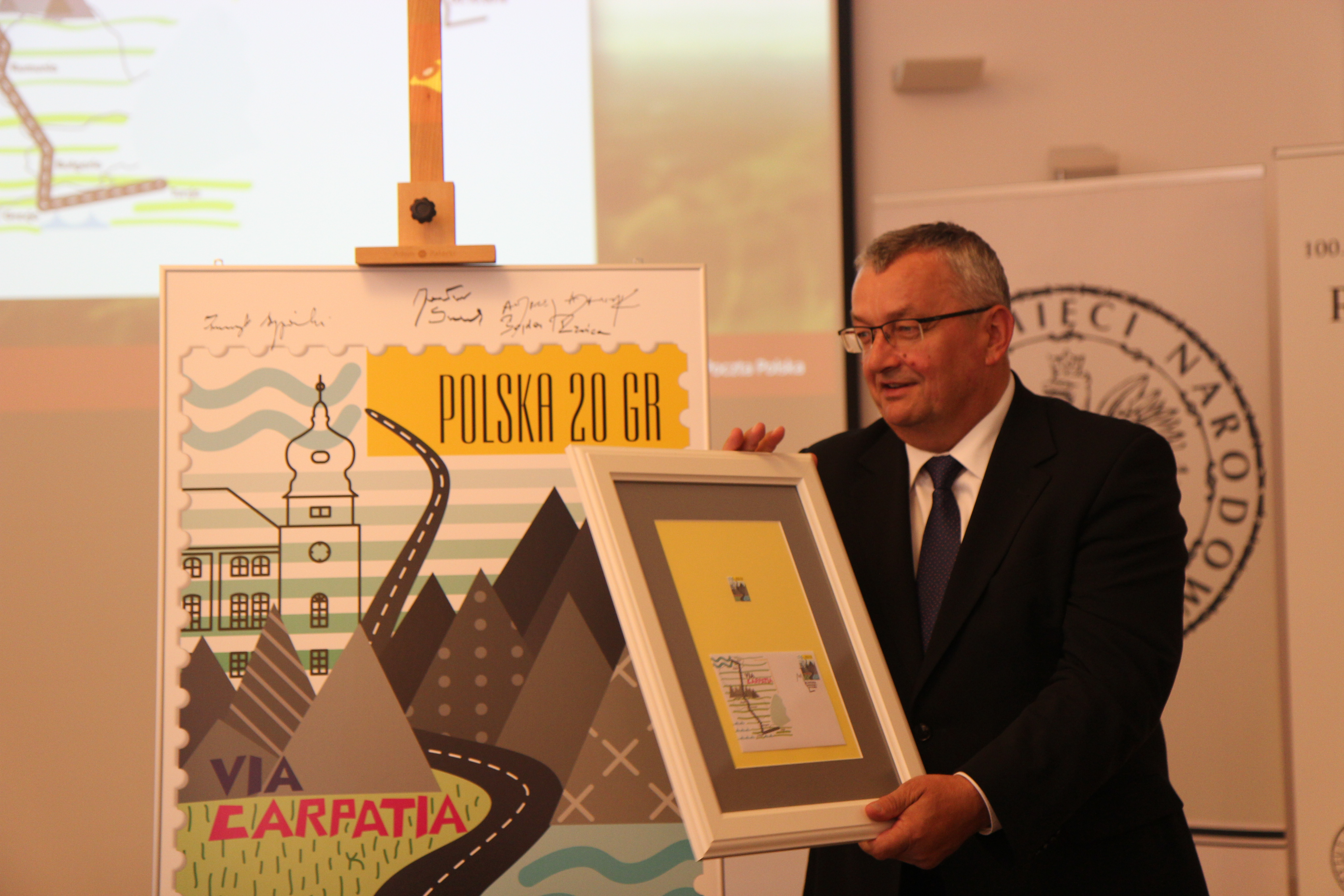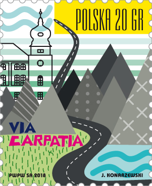 3 października 2018 r. Poczta Polska wyemitowała specjalny znaczek prezentujący szlak drogowy Via Carpatia, który będzie przebiegał z Kłajpedy i Kowna na Litwie przez Białystok, Lublin, Rzeszów i słowackie Koszyce do Debreczyna na Węgrzech, a dalej do Rumunii, Bułgarii i Grecji. Ma docierać m.in. do rumuńskiego portu w Konstancy nad Morzem Czarnym oraz greckich Salonik nad Morzem Egejskim.