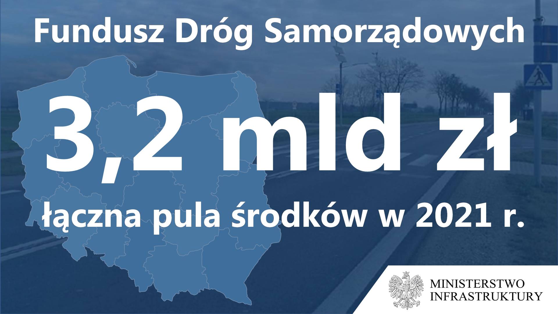 Minister Infrastruktury zaakceptował podział środków Funduszu Dróg Samorządowych, które zostaną przeznaczone w poszczególnych województwach na dofinansowanie dróg samorządowych w 2021 roku. W ramach naboru na 2021 r. na wsparcie zadań powiatowych i gminnych zaplanowano 3,2 mld zł.