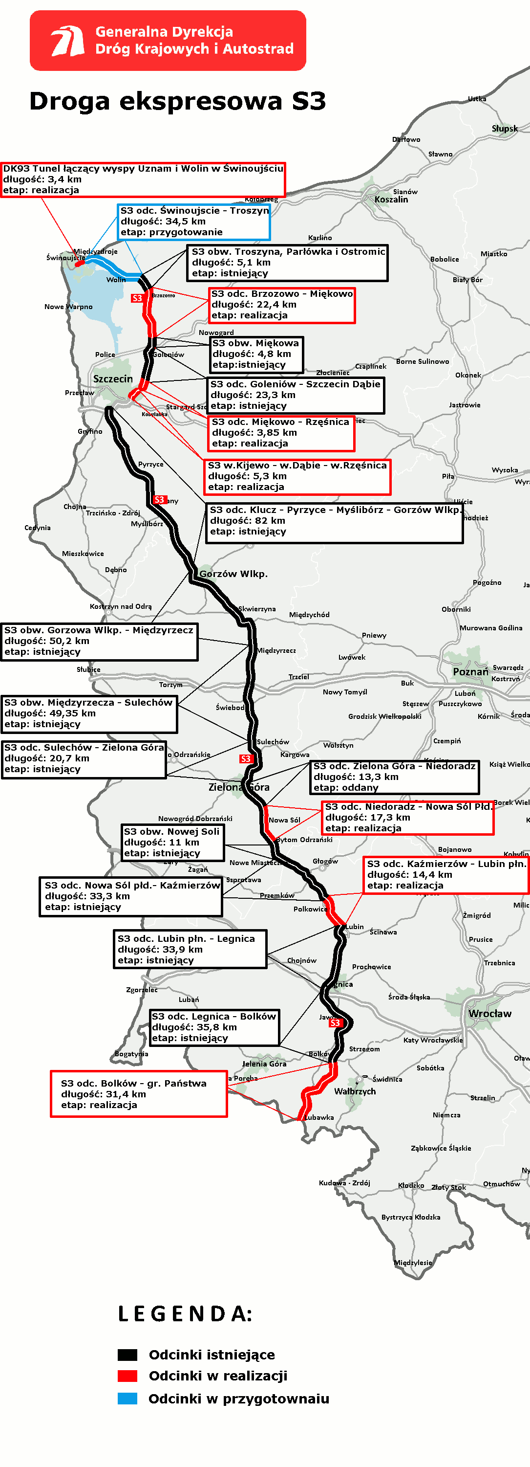 W ciągu ostatnich miesięcy udostępniano kierowcom ponad 100 km S3 w województwach lubuskim i dolnośląskim. W najbliższych latach realizowane będą pozostałe brakujące odcinki tej trasy, zarówno na północy jak i południu Polski. Między Szczecinem a Świnoujściem w realizacji jest obecnie ponad 40 km trasy na odcinkach Brzozowo – Miękowo i Miękowo – Rzęśnica. Roboty budowlane ruszą tam wiosną przyszłego roku, a ich zakończenie nastąpi w 2021 r. Trwają też przygotowania do ogłoszenia przetargu na ostatni fragment S3 w województwie zachodniopomorskim pomiędzy Świnoujściem a Troszynem, o długości 33 km.