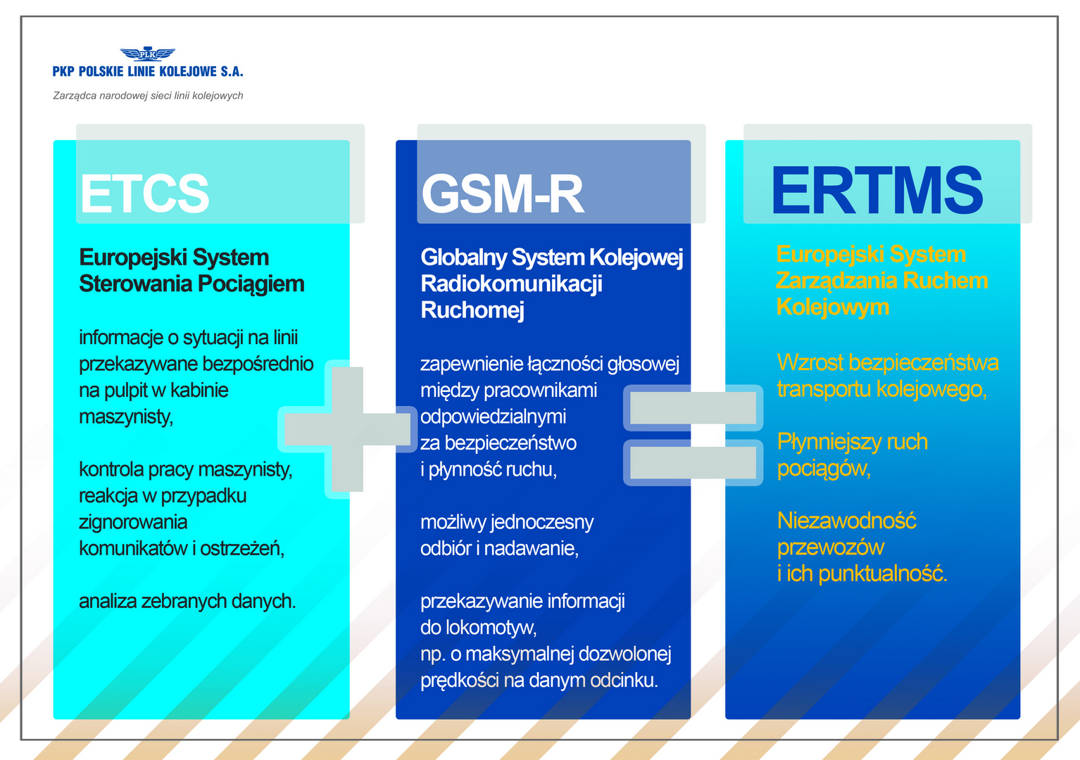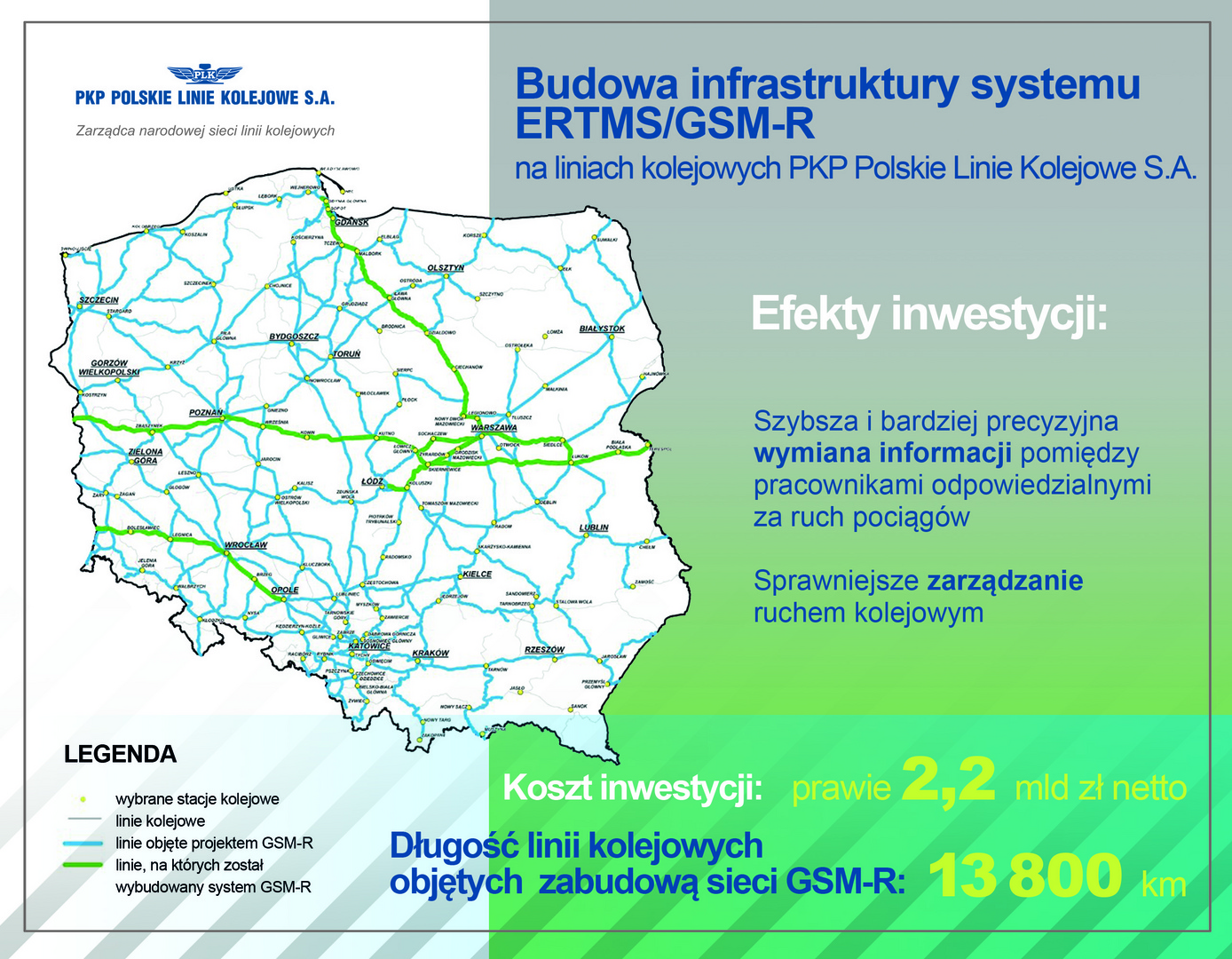 PLK wdrażają najwyższe europejskie standardy w zarządzaniu ruchem pociągów. Dotychczas stosowane technologie nie pozwalały na jednoczesne nadawanie i odbieranie komunikatów, co wydłużało wymianę kluczowych informacji. Dzięki systemowi GSM-R możliwa jest łączność głosowa równocześnie w obu kierunkach oraz przesyłanie wiadomości tekstowych. Pozwoli to na sprawniejsze zarządzanie ruchem kolejowym.