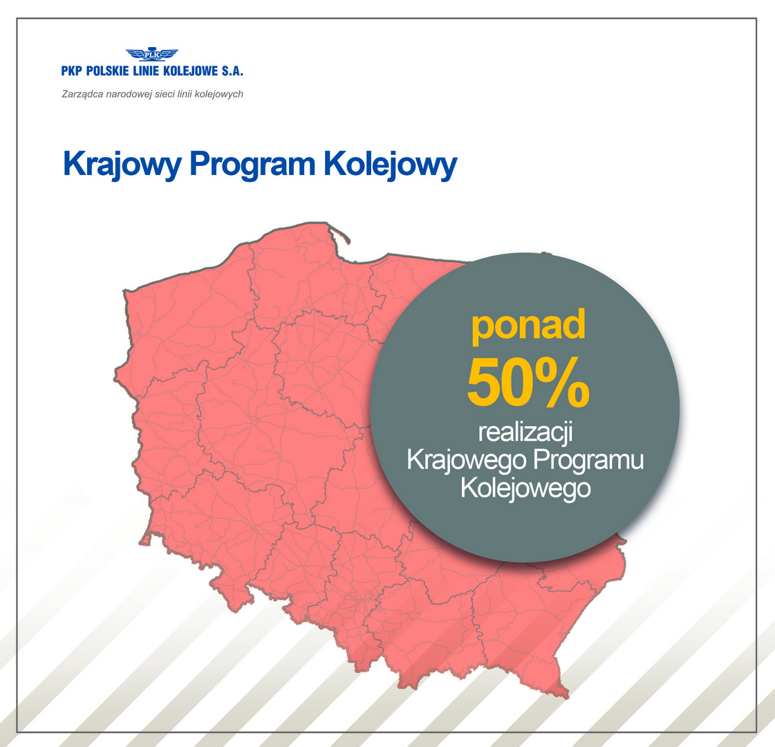 PKP PLK nie zwalniają tempa realizacji inwestycji. Rok 2018 zaczął się równie dynamicznie jak poprzedni. PKP PLK w I kw. 2018 r. podpisały umowy na łączną kwotę 4,5 mld zł netto, co oznacza, że wartość podpisanych umów jest prawie 2 krotnie wyższa niż w I kw. 2017 r. (ponad 2,3 mld zł netto). Ogłaszane są kolejne przetargi. W I kw. 2018 r. PLK ogłosiły postepowania na ok. 2,1 mld zł wartości szacunkowej, czyli mniej więcej podobnie jak w tym samym okresie w 2017 roku, kiedy wartość ogłoszonych przetargów w I kw. ub.r. wyniosła 2,3 mld zł. Obecnie realizacja Krajowego Programu Kolejowego wynosi ponad 50 procent.