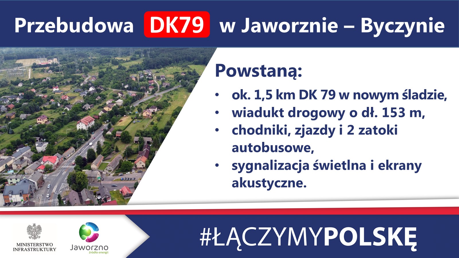 W ramach rozstrzygniętego przetargu w ciągu drogi krajowej nr 79 powstanie obwodnica dzielnicy Byczyna o długości ok. 1,5 km. Odcinek będzie poprowadzony nowym śladem po estakadzie. Inwestycja podniesie poziom bezpieczeństwa ruchu drogowego, usprawni komunikację na pograniczu Śląska i Małopolski oraz uspokoi ruch w centrum dzielnicy Byczyna.